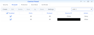 In DSM 5.x, Synology has a feature (under Control Panel->Security->Firewall), where you can set up Firewall rules which can be fairly granular in terms of applications, ports, IP addresses (or ranges) , and even on a country basis, and allow you to specify whether, if the rule is met, access is allowed or denied. And since I’d already done a little work to see which countries the (apparent) access attempts are coming from, I decided to set up a country specific block. Now, I know before I started this that IP addresses can be spoofed, so this is only one meager piece to trying to secure the server, but better than nothing. I found this guide as a starting point, though you’ll need to modify for your own circumstances, and, as always, I’m not responsible for any bad things that might happen to your NAS if you follow this process.