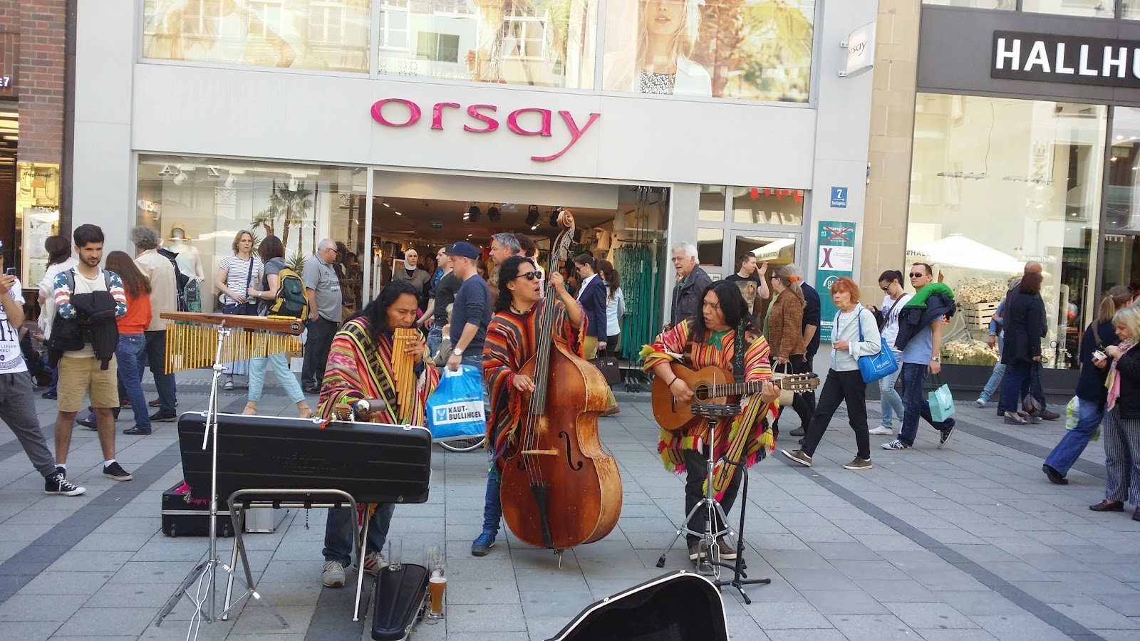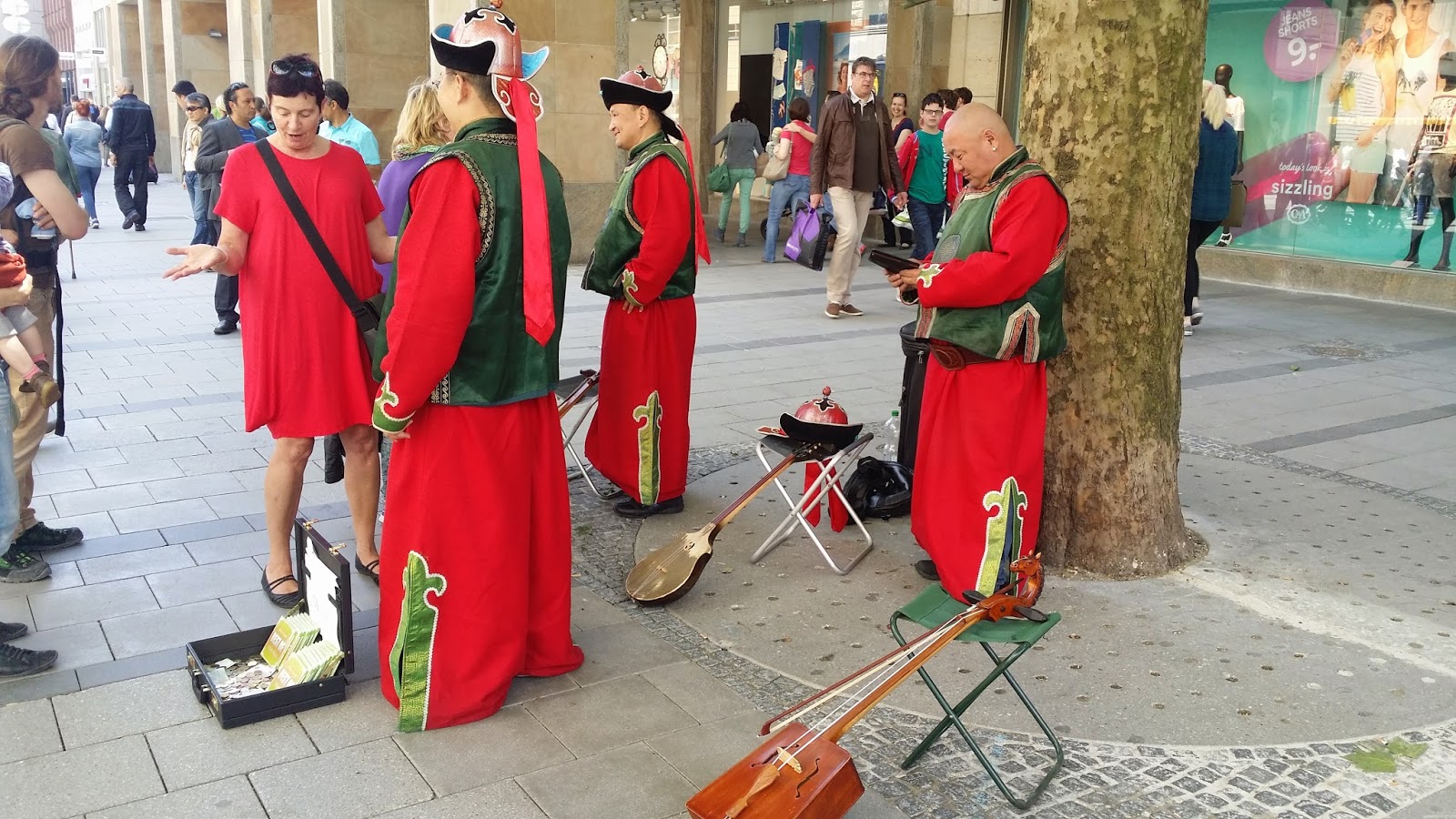 Munich’s Englischer Garten is enormous, and on a bright sunny Saturday, we have a lot of company! Partly cloudy, 70 degrees. On the way out to the park, on the Marienplatz (pedestrian shopping area), we passed by a couple of performing groups we’ve seen in the past- Mongolian music group and a South American Indian music group. We’ve seen both groups here for years.