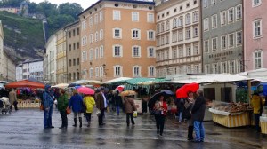 It’s Saturday market day here, and so like other cities, there are stalls with most everything from bread to flowers, meat, cheeses, etc. The rain doesn’t seem to have diminished the crowd too much. We did manage to have some Munchener Weissewurst (delicate little white sausages) mit senf (with mustard). The buildings around the square date from the 13th century, though the Salzburg Cathedral is much older than that.