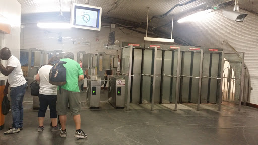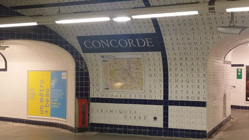 At Concorde, le Metro is busy, but not packed as it would be on a weekday. There are families traveling together, and even a few unoccupied seats.