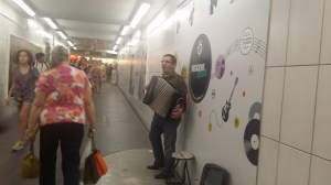 In the underground after getting off the Metro at the Louvre, we walked through the underground shopping mall. The glass pyramid in the courtyard of the Louvre above comes down to a point in an inverted pyramid, in the shopping mall below, right in front of the Apple store. There’s an interesting legend about the number of glass panes in IM Pei’s structure.We had taken the Metro to see if we could find the site of one of the beaches they have along the Seine each July. Yes, beaches on the river in the city. Paris Beaches in the summer
