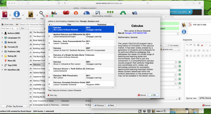 I started out with a few items that were actually books and added more material, usually through drag and drop (there is a command line interface as well) . One of the key elements in managing this collection is search. To search, beyond simple things like title and author, you need metadata. Calibre has a means of searching, but it is dependent on the items in the database having metadata. Calibre has the ability to import metadata, but it is mostly dependent on the title of the file and any metadata already in the file. So this is where the work comes. You can individually edit the metadata for a file, or do so in batch mode, to add the proper title and author so the import process finds it. You can also add tags as another means to search and group. This search capability means that Calibre is very powerful, but only if you’ve organized and tagged (metadata and tags) to allow it to do so. You can have multiple libraries if you wish, organizing them according to type of ‘book’, for example. I’m not sure I’ll take that as a first step, but it is nice to know the capability is there later on.