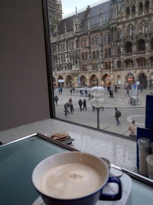 We were going to have some gluhwein, a warmed wine mixture that’s popular in the winter, but it seems it’s too late in the season for that, though we will probably buy some toasted chestnuts; we saw a number of stands selling them along the Marienplatz.