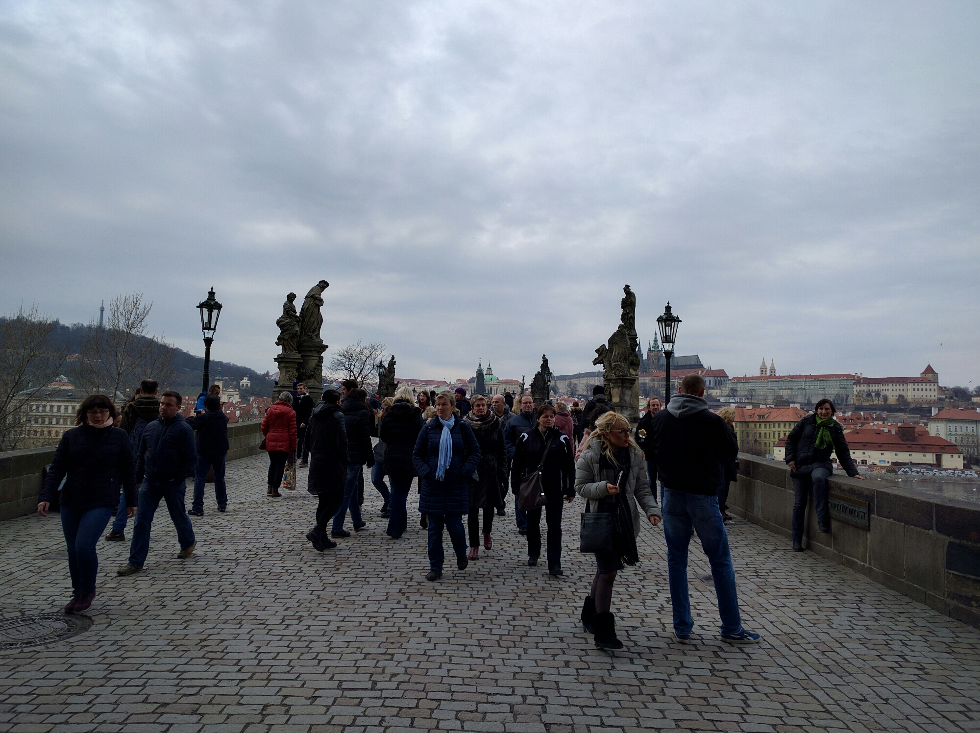 From the Basilica, we took a tram down along the river near the Charles Bridge. The Charles Bridge is a pedestrian bridge over the Vltava river and it is lined with statuary (historic and religious) along each side. The bridge is teaming with people. I can only imagine in high tourist season it would be shoulder to shoulder. Along the bridge, artists are offering portraits, a few musicians and a few souvenir vendors, but not too much to detract from the sights.