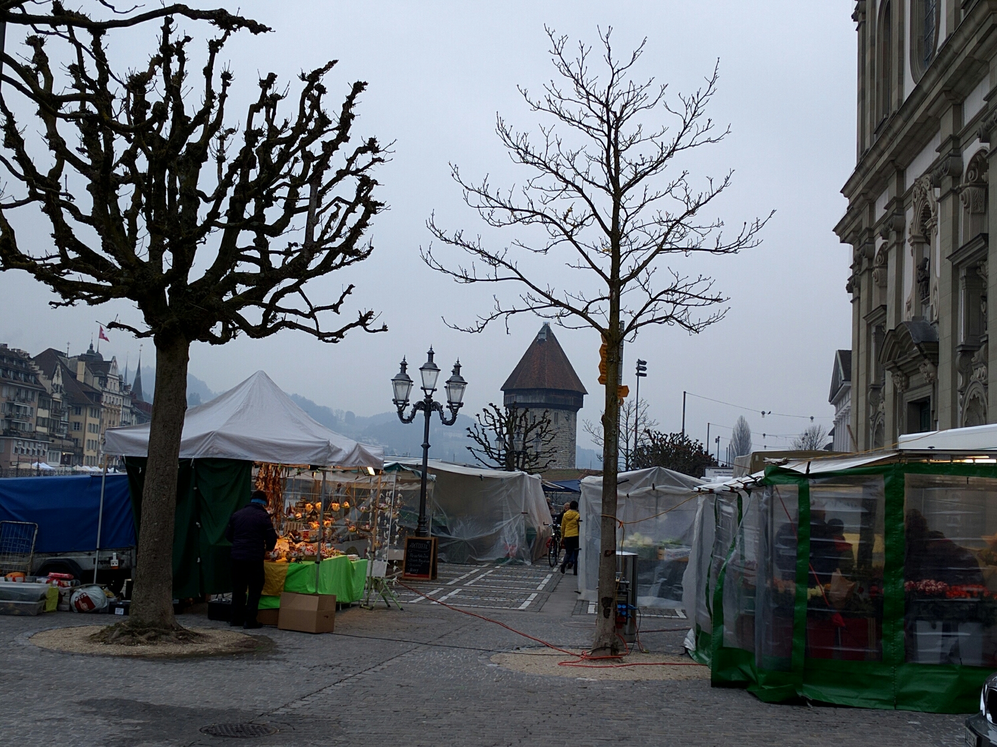As we leave our hotel for the train station, we see the local merchants and farmers setting up for market day along the Reuss river, on both the old town and ‘new’ side (rail station side), in the vicinity of the Kappelkebrucke, on this Saturday. They’re still setting up, but they sell a variety of things from flowers to hand made articles and cheese, breads.