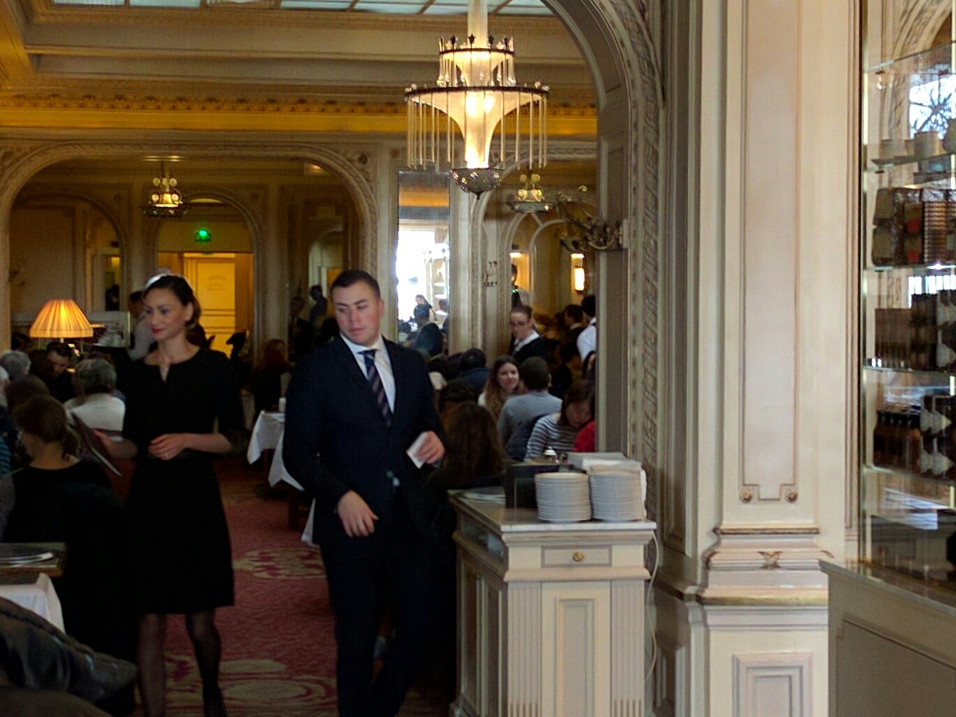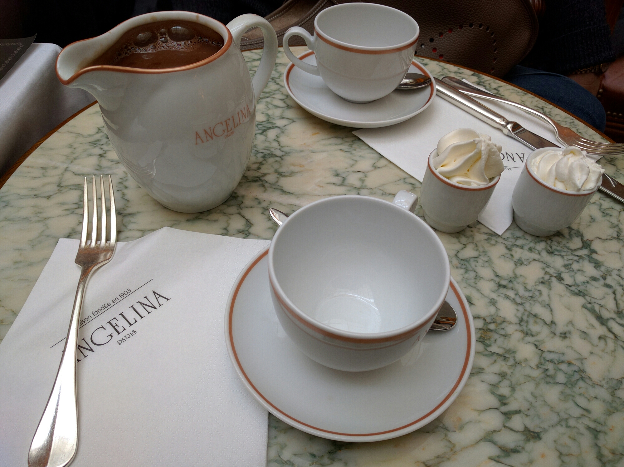 Angelina is a tea room located in the Rue de Rivoli. It’s SRO for those like us looking for a break from the cold. It’s not a long wait until we are seated and order what we really came for: Chocolate Africain. An extremely dense hot chocolate, accompanied by your own little helping of whipped cream to mix into it. (See first photo). La doloreuese (the painful one, or the bill) is 25.80€ (about $26.00) for two Africain and one pastry. By the time we leave, the waiting line extends through the entry door and outside by a dozen or more people.