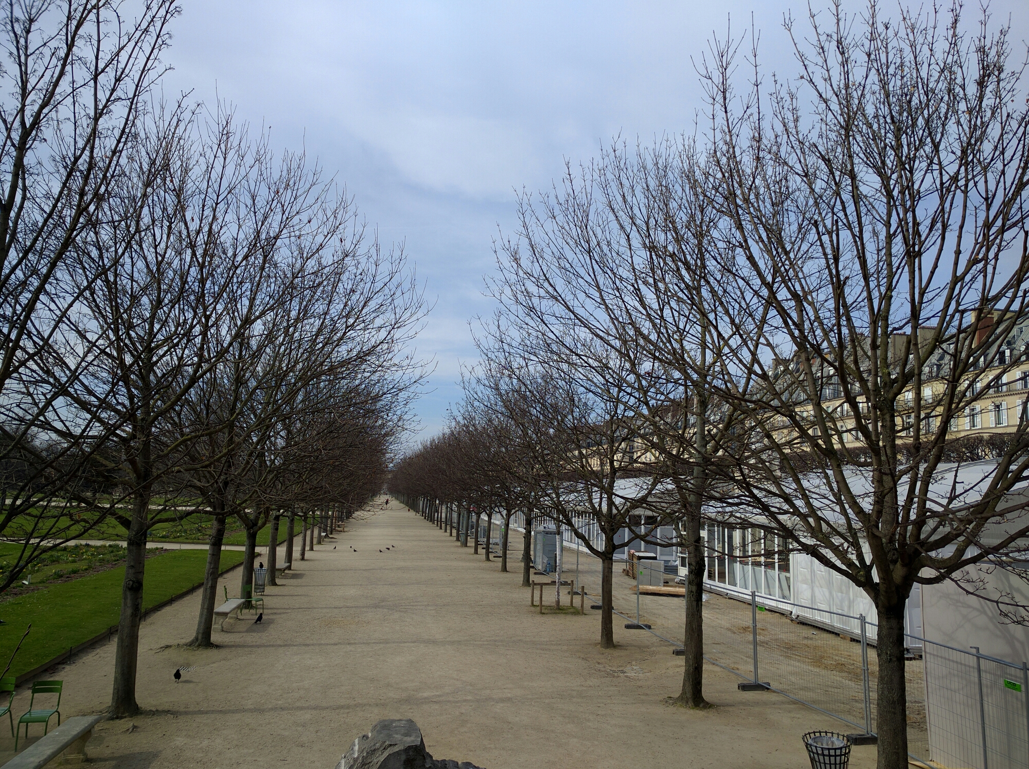 It’s fairly cold, but a mostly clear day. We haven’t yet been over to the Tuileries, which is a popular destination for Parisians on the weekends. The workers are out putting together the ‘tents’ for fashion week, just inside the Tuileries, on the rue de Rivoli side.