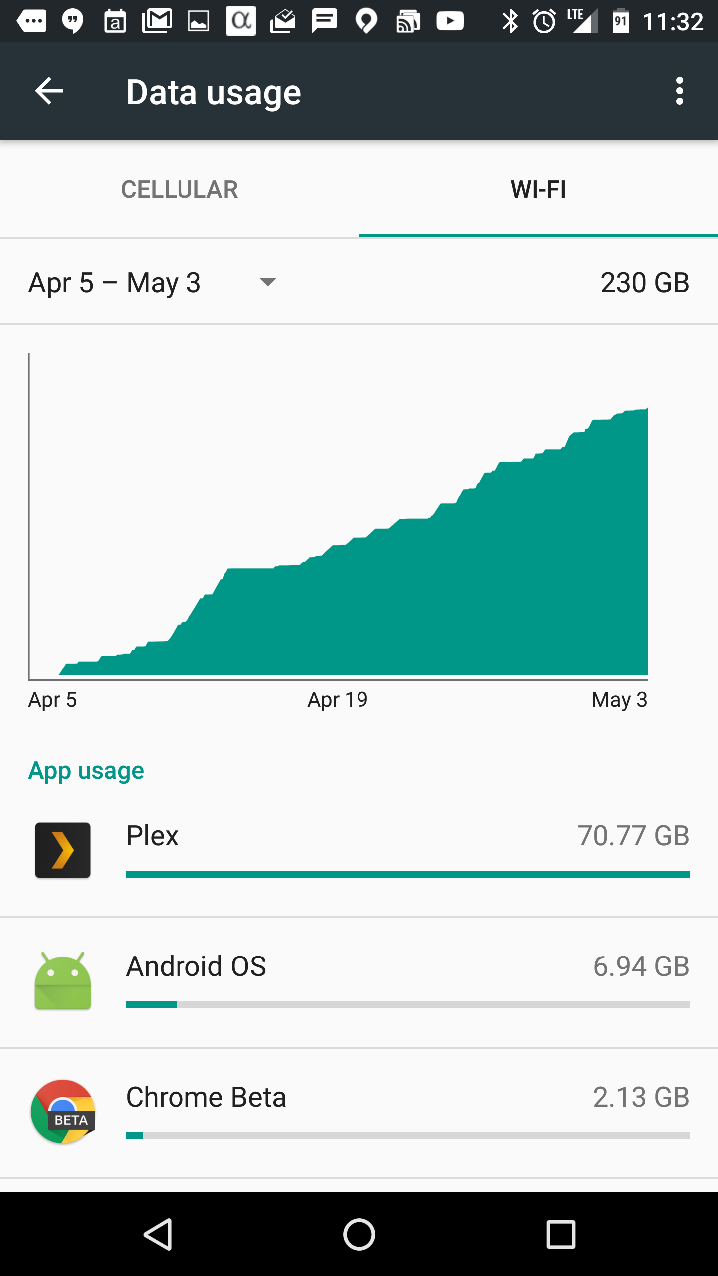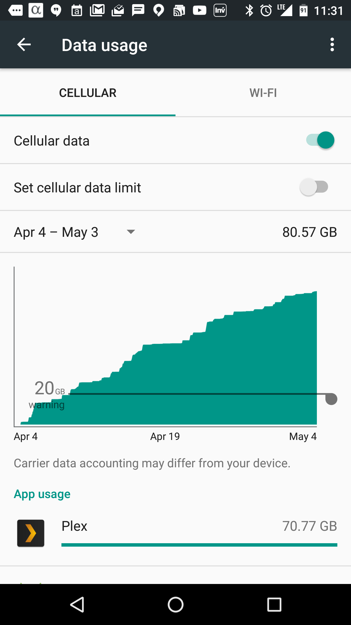 It’s a good thing I have an unlimited data plan for my cell phone. It’s not like I’m trying to use lots of data. It seems to be the consequence of mostly one app, Plex, which I use to stream (mostly) mp3 music when away from my home network.