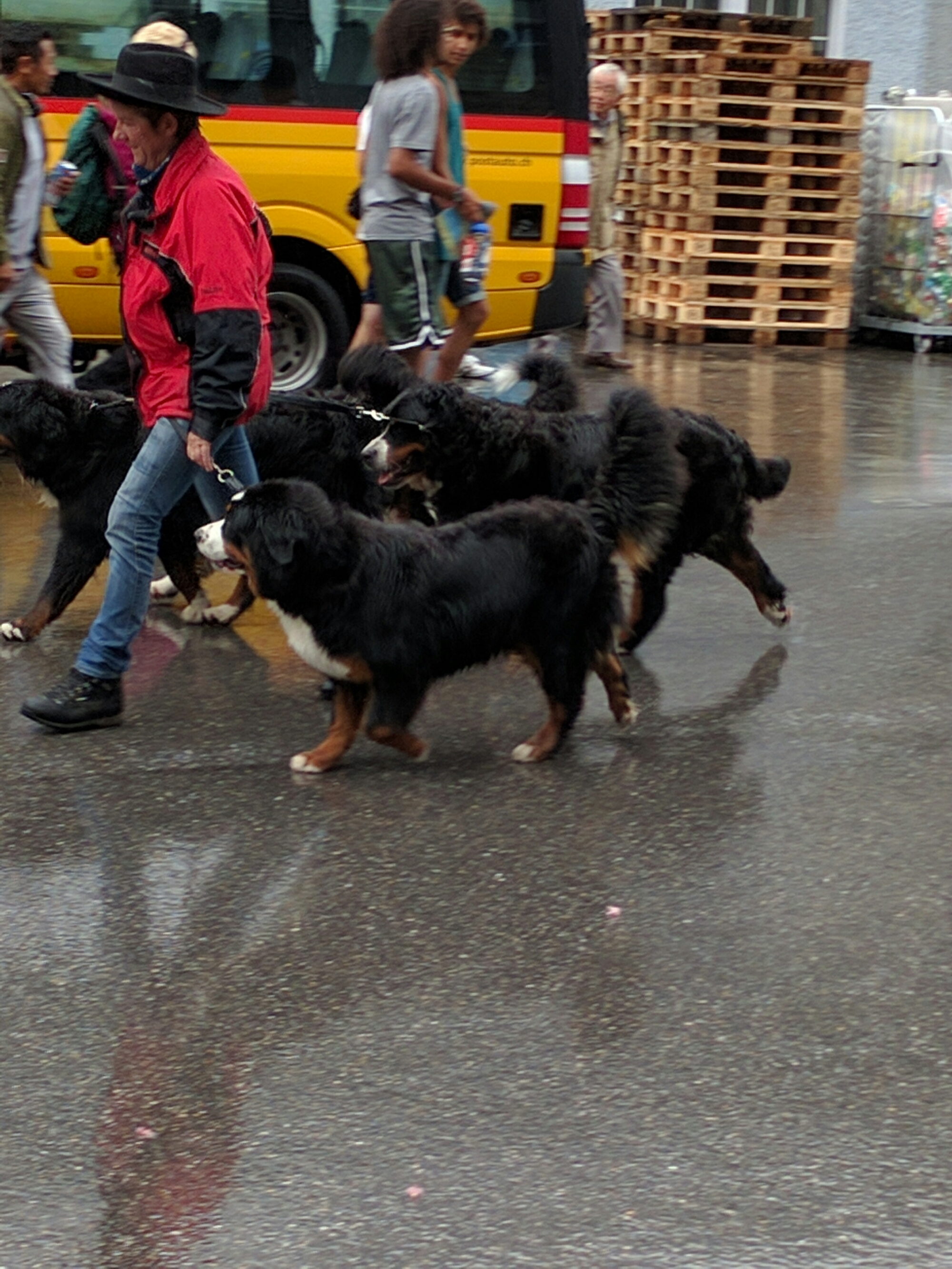 After returning from Wengen, we walked across from the Lauterbrunnen rail station to the Bergbahn Lauterbrunnen-Murren lift station and where the Postbus stops. The Postbus runs through the valley and we’ve taken it from the extreme end of the valley back to Lauterbrunnen. But never in the company of these guys! She has four Bernese Mountain dogs that board the Postbus with her. These were working dogs who work up around the Jungfrau as rescue dogs.