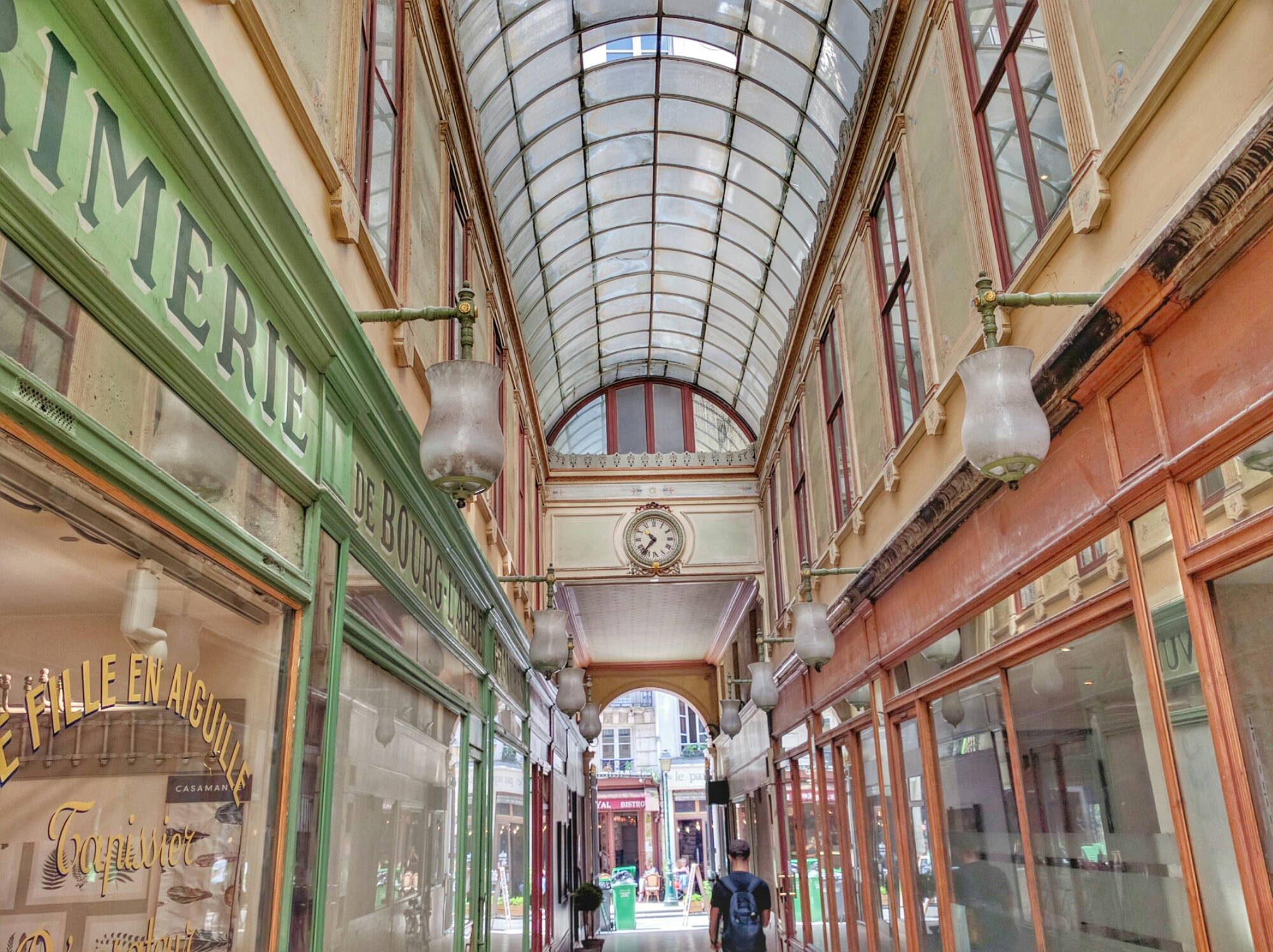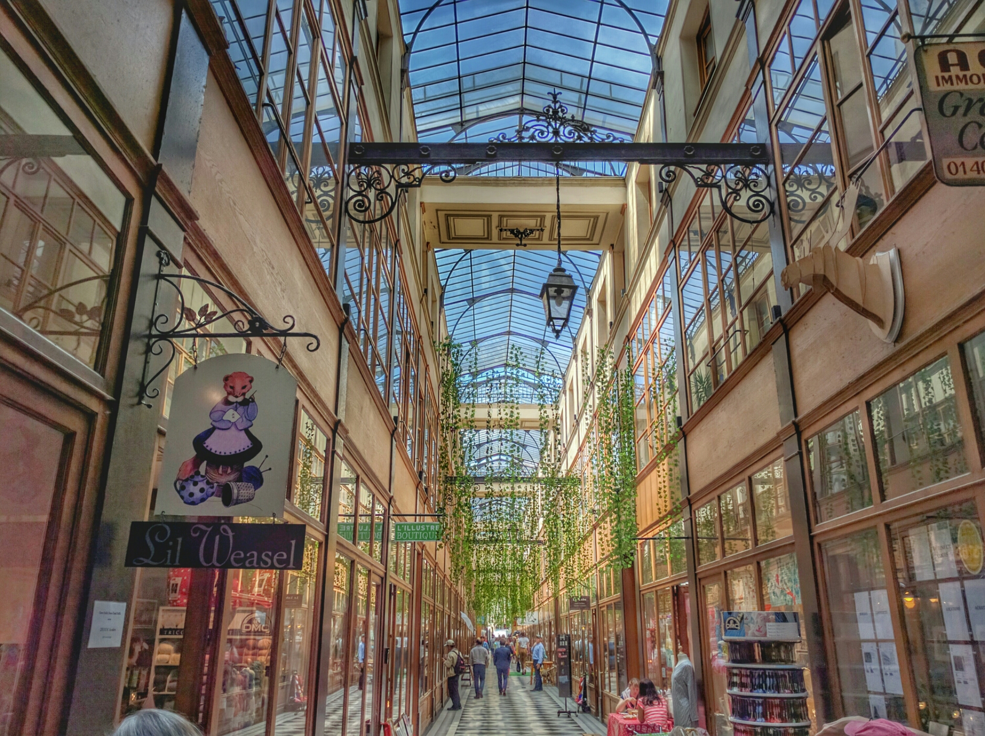 The “plus grande” of the the first two was definitely le Passage du Grand Cerf. Just across the street from Passage Bourg-l’Abbe, the Passage du Grand Cerf, built in 1825, was full of shops and much better kept. There were a variety of shops from a yarn shop, soap shop, artists’ galleries, interior decoration shop with old (or apparently old) hardware, cafés. It’s multi level as well, with crosswalks over the central core. The photos will help you appreciate none of them are very wide.