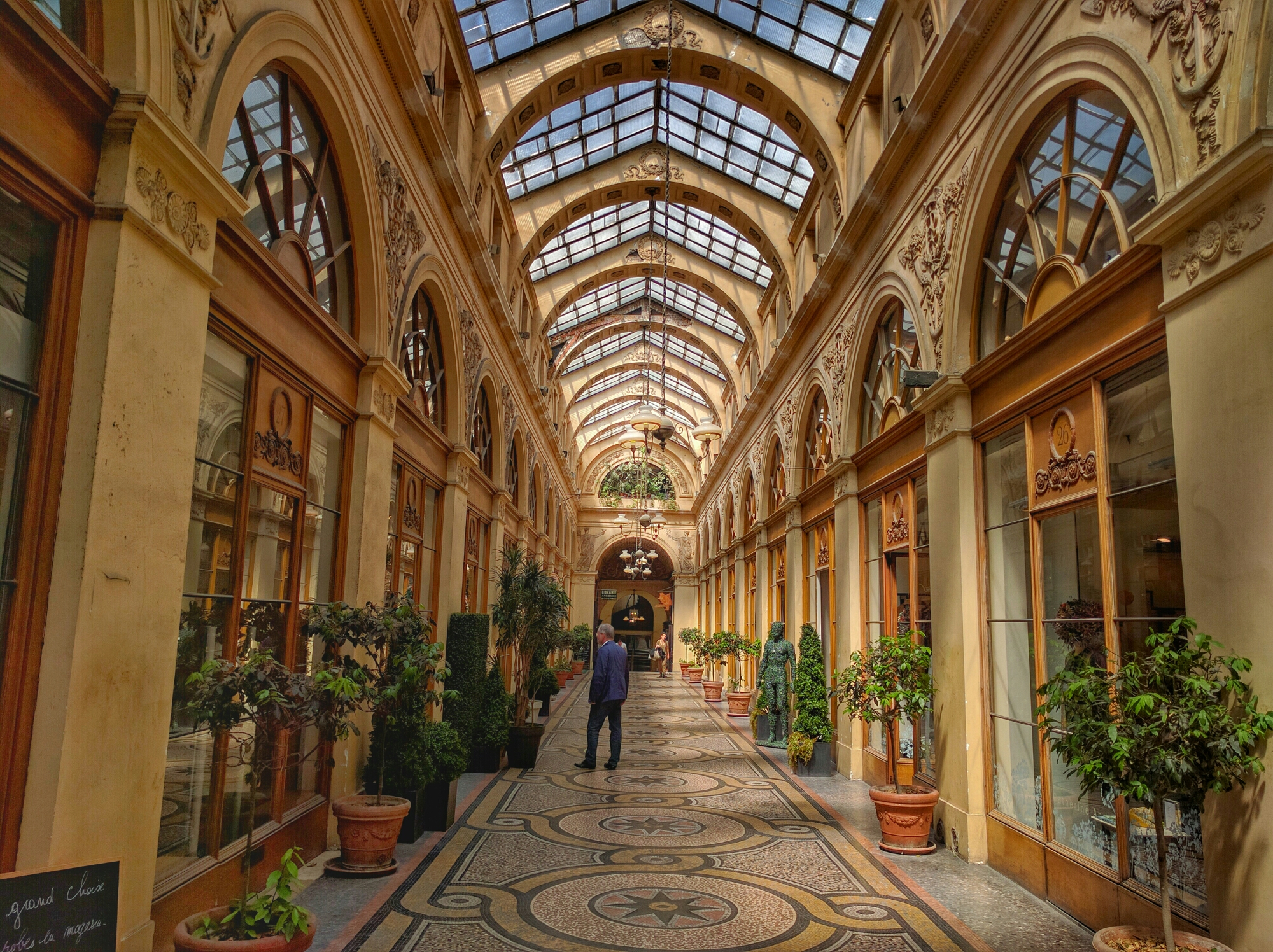 Built in 1823, it’s larger than either of the other two we visited and one wing was being renovated with a multi-level bar and café. The notable design aspects of Galerie Vivienne (if you read French) were it’s mosaic floors and glass ceilings. Apparently there are also apartments on the upper floor, as we saw a winding staircase and residential mailboxes behind an entry door.