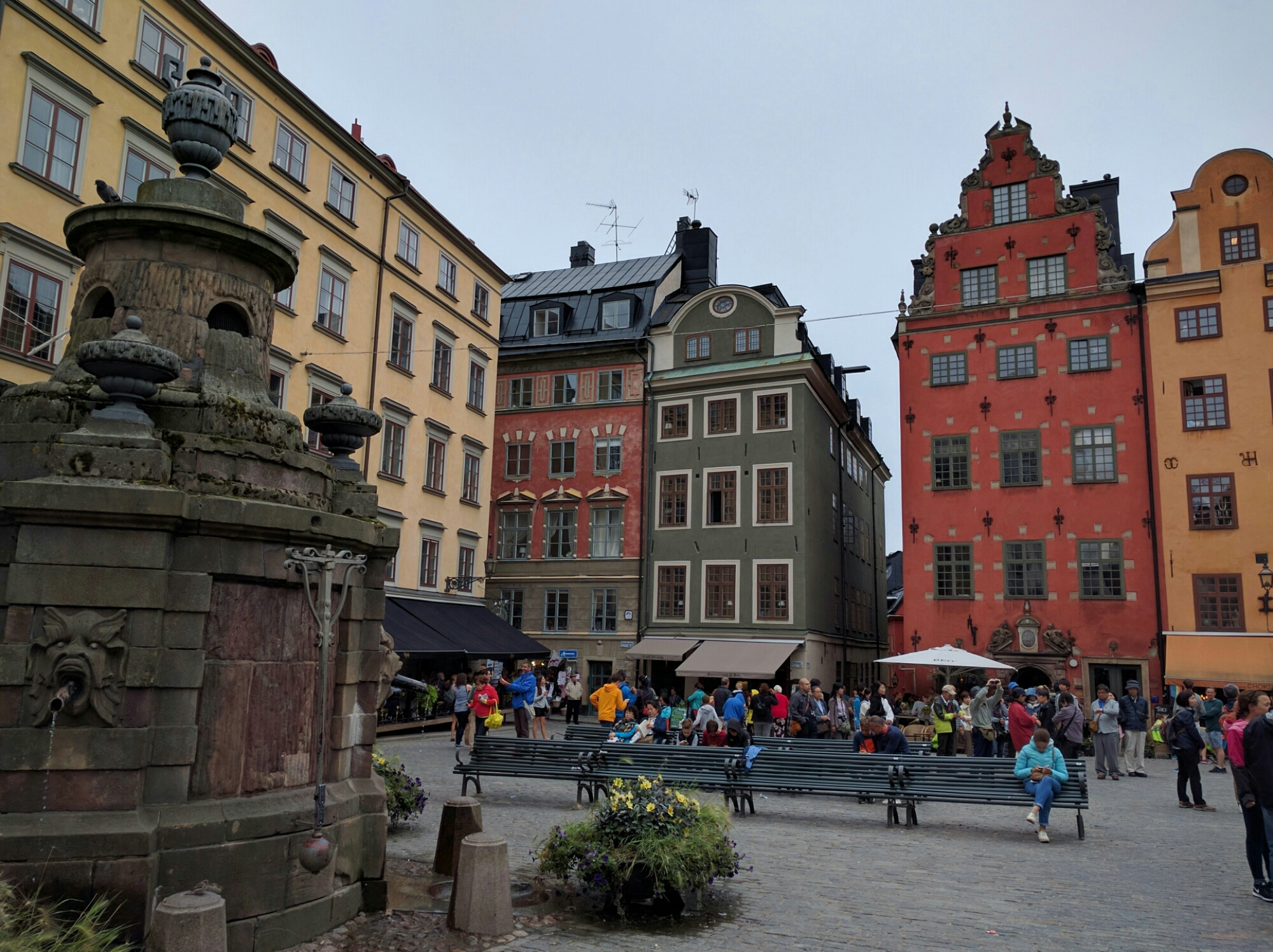 From the Nobel Museum, just around the corner from the Kungliga Slottet, we walked around Gamla Stan some more. The square outside the Nobel Museum, Stortorget, is ringed with small cafés and shops. Some of the patrons were snuggled up in blankets provided by the café. The buildings appear to date from the 1660’s.