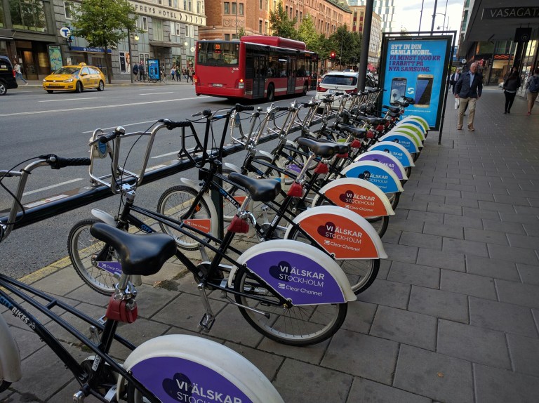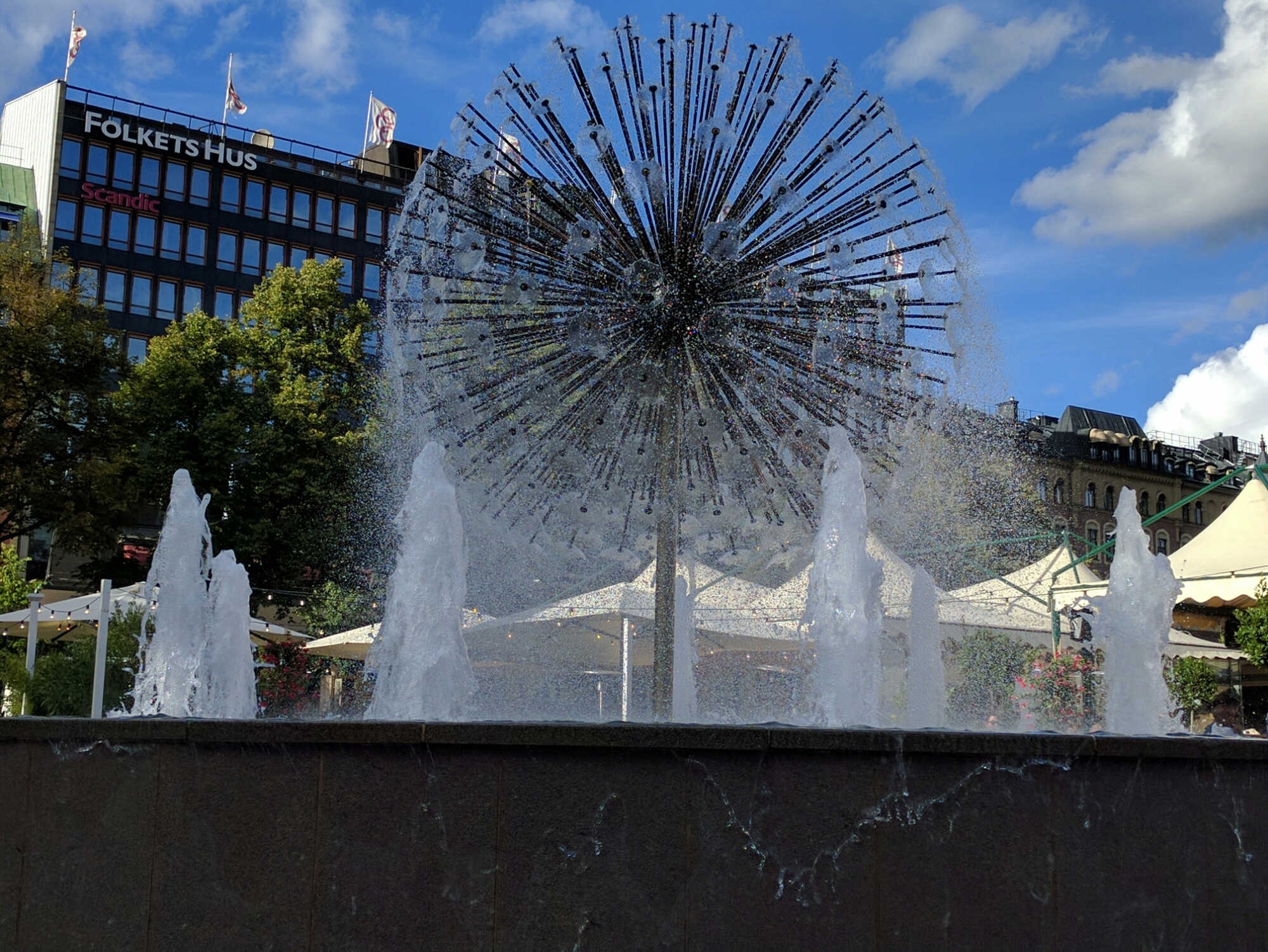 We walked down Vasagatan, a large shady street with some cafés (and a McDonald’s, Burger King, 7-Eleven, but no Starbucks 😯) and a lot of office buildings, down to a small park (fountain below). Not nearly like Amsterdam (where there is a greater than 1:1 ratio of bikes to people), but there are a lot of cyclists here.