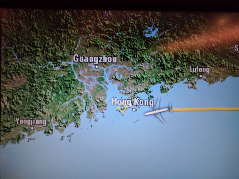 Flights like this are very disorienting. We departed at 10:25pm West Coast time. I’ve slept for quite a while off and on, and while it should be 10:30 am on the 16th, it’s pitch black outside. Since we each have our own little cubby, as you walk through the business class cabin, some people are still asleep, others are watching the in-flight entertainment system. The flight tracking system seems to show us with about 3 hours remaining to HK, where it’s 2:48am. We are scheduled to arrive at 5:30 am