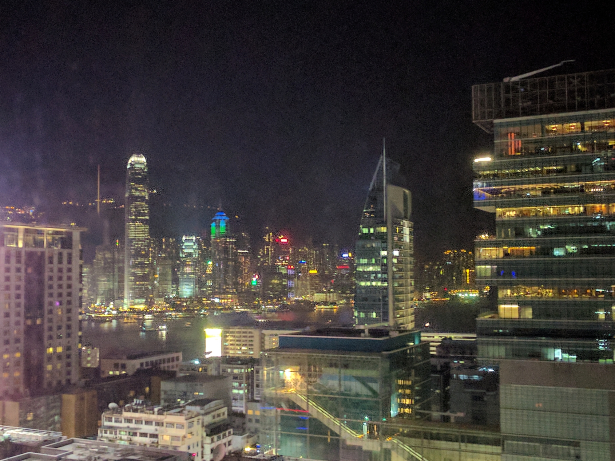 The trip back to the hotel seemed twice as long as coming here.We’re on the club floor (23rd) of our hotel looking out over the harbor. Some of the buildings along the harbor are lighted and you can see dimly lit small boats making their way upstream. There’s an ‘illmination’ at 8pm where some of the taller buildings fire off a series of bursts of a green laser up and down the harbor, though it doesn’t last too long. The Chinese New Year fireworks are supposed to be a real event.