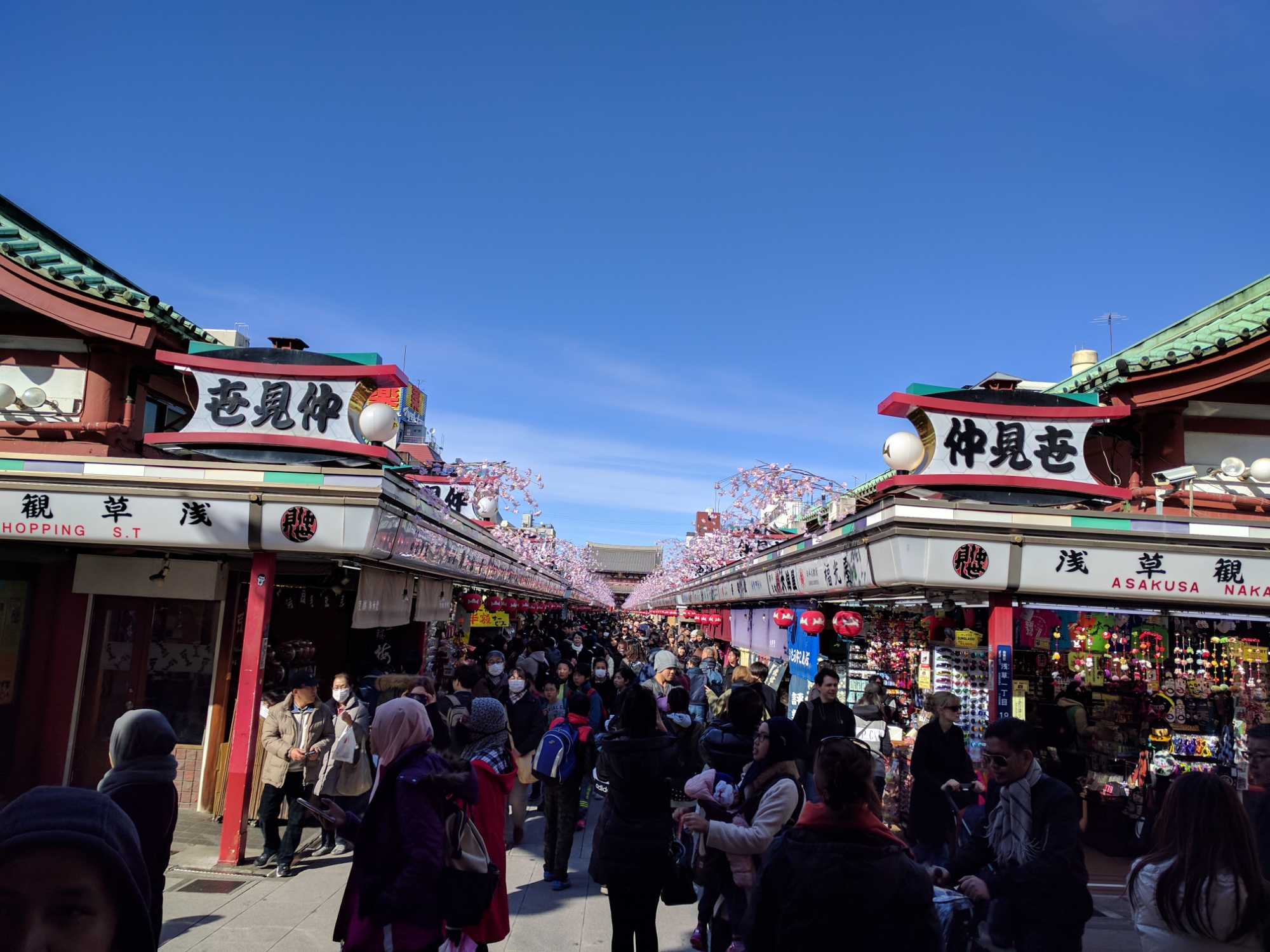 Asakusa is noted as the home to the Sensō-ji Buddhist temple. From the subway, it is a short walk to the entrance to the temple entrance. As you walk closer to the temple, you’re presented with a rather large number of (YouTube link) small shops in stalls along the main entrance walkway.