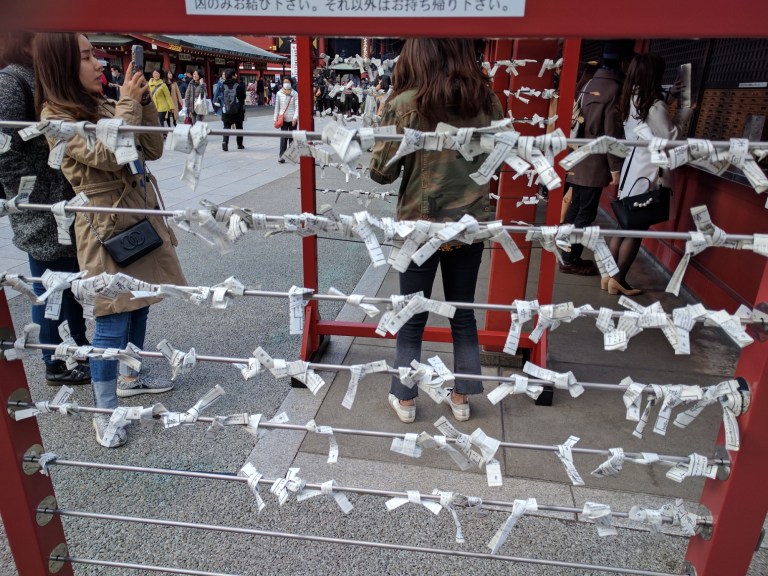 Prior to even getting close to the shrines, after walking past all the small shops, you find areas where people are getting Omikuji, which are small strips of paper which contain your fortune. To get your fortune, you donate a 100 ¥ (less than $1) into a long tube, then shake the tube for a bit until a small stick comes out. You take the number that’s on the stick and find the corresponding strip of paper (Omikuji) from the appropriate numbered drawer (there’s a small wall of them). The contents of that Omikuji tells your future. Though there are 7 types of fortunes you might receive, if you receive one with bad fortunes, you tie it onto the rods on a nearby rack and leave it there so your bad fortune doesn’t follow you home. If it’s a good fortune, you take the slip of paper home with you.