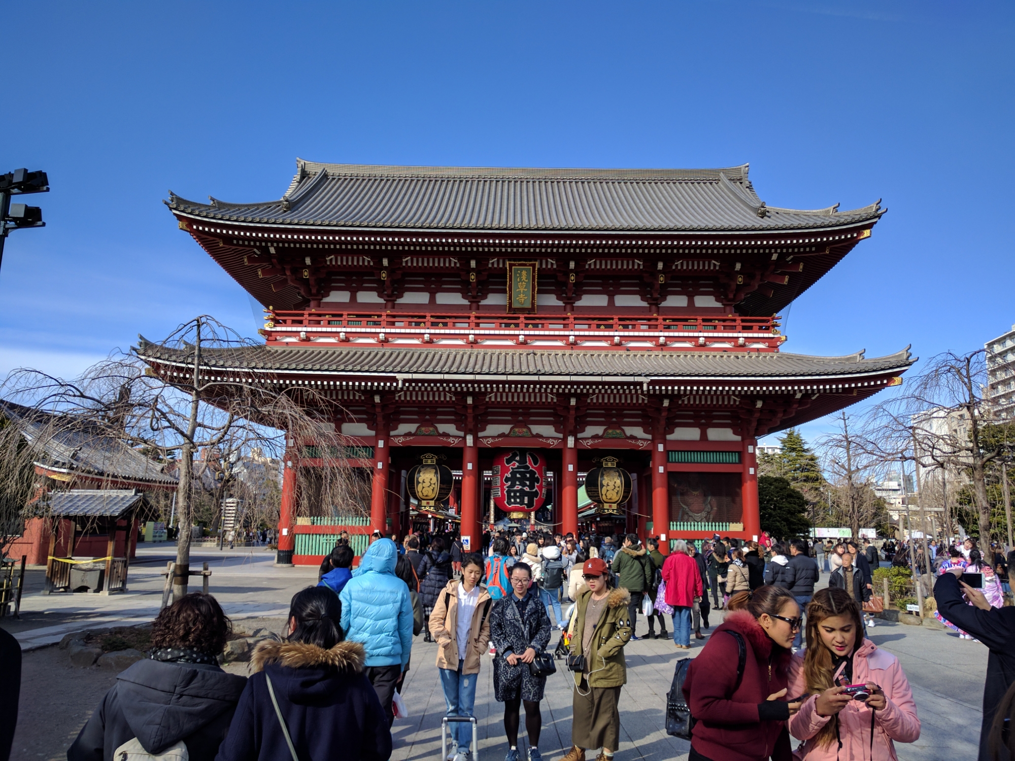 We made our itinerary for the day to go to Sensō-ji, part of the Asakusa area of Tokyo.Sensō-ji is Tokyo’s oldest temple. Asakusa is a more suburban area and you aren’t dwarfed by towering skyscrapers. On the Ginza subway line, Asakusa is the end of that line (not hard to figure where to get off 😉) and only about 22 minutes from our hotel. It’s a cool, clear, but windy day.