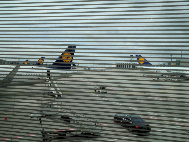 This will be a travel day. Being one of the main travel hubs in Germany , the tarmac is dominated by Lufthansa planes, some few American carriers and some others unfamiliar to us. That black Mercedes you see in the foreground is the limo to the plane if you are traveling 1st Class on Lufthansa. Needless to say, no car for us today.