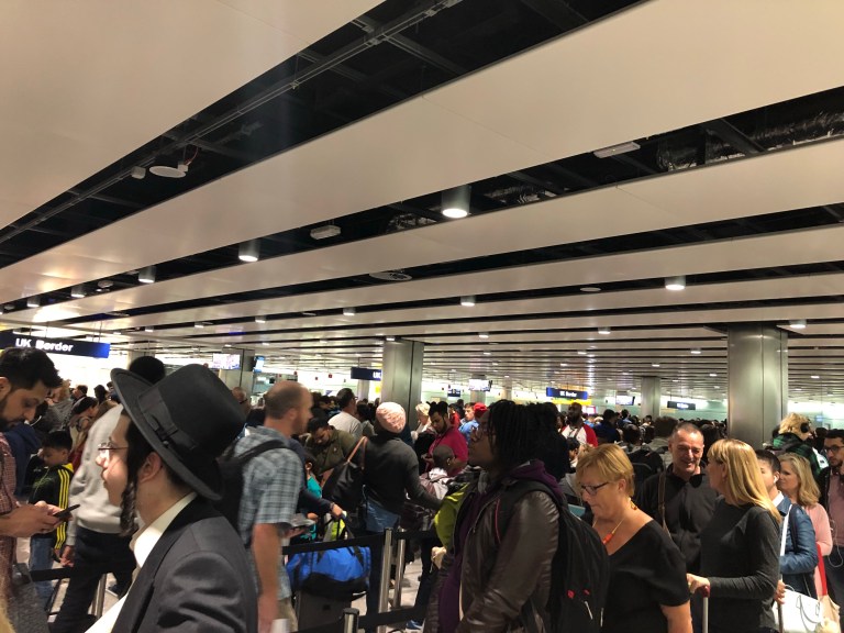 Sitting in steerage class, aka coach, wasn’t so bad as we had bulkhead seats, but just not possible to sleep. Arrival at Heathrow airport, where there’s no jetway and we get to haul our baggage down the stairs to the terminal bus. Customs clearance is orderly, but a nightmarish line. 70 minute line for non EU/UK passports.