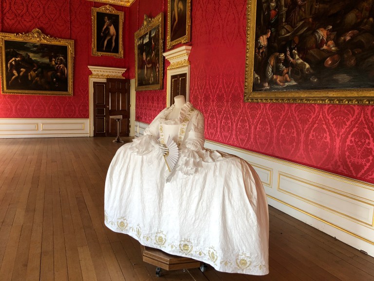 Ladies’ dress during evening court was exceedingly formal and wide! I imagine they had to go through doorways sideways! The amount and opulence of material in their dresses signified (to others), their wealth.