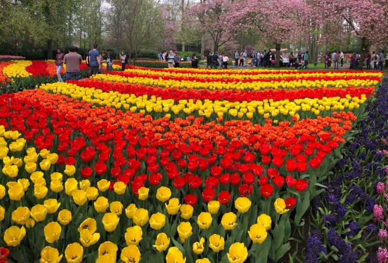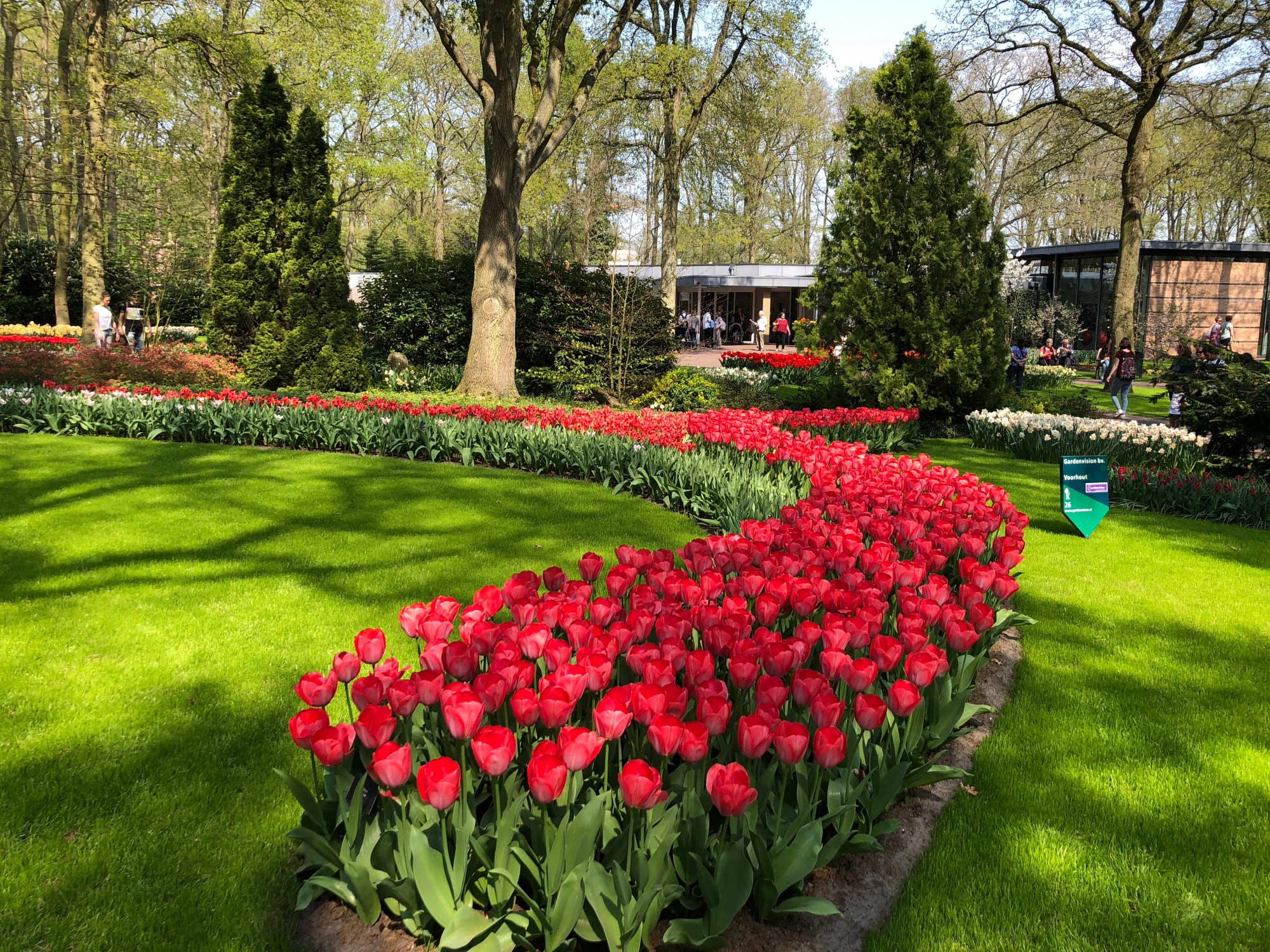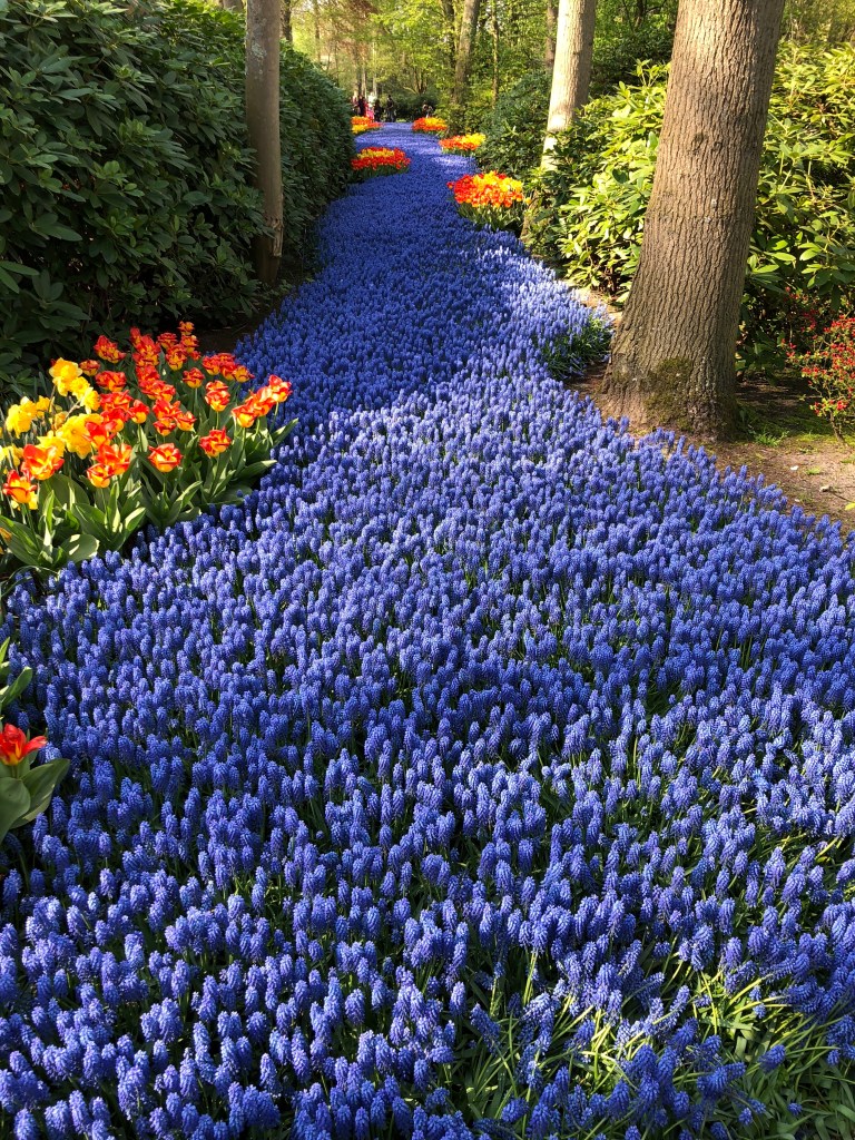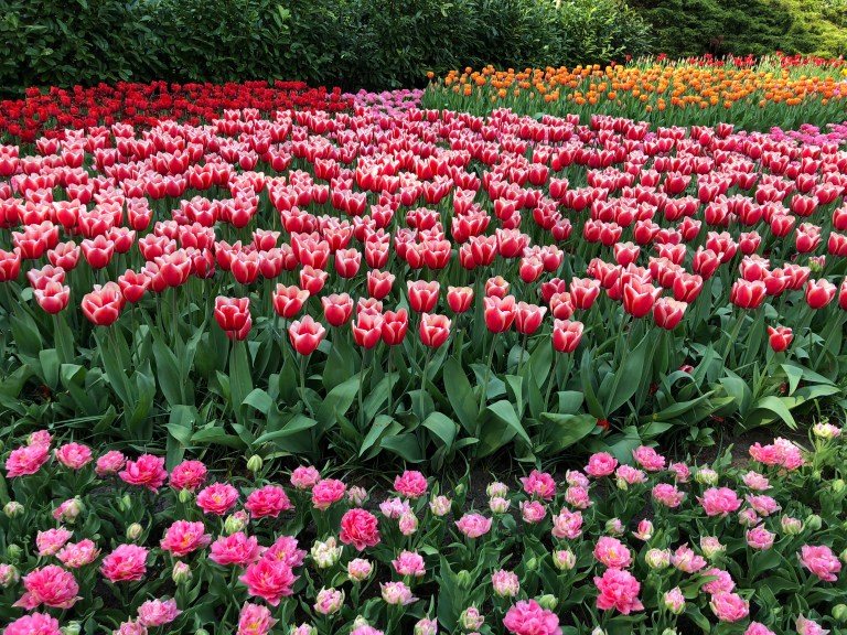 The buses travel an additional 35 minutes to get to the small city where Keukenhof is located. As you get closer, you begin to see entire fields planted in tulips like you’d see if planted in corn or soybeans. Acre upon acre of red, pink, white, blue. Tulips are big business in Holland. The world’s largest trading center for plants and flowers is not far away and may be where some of those field grown tulips are destined. And it’s likely that tulips you find at a local florist or in a local store came from this region.