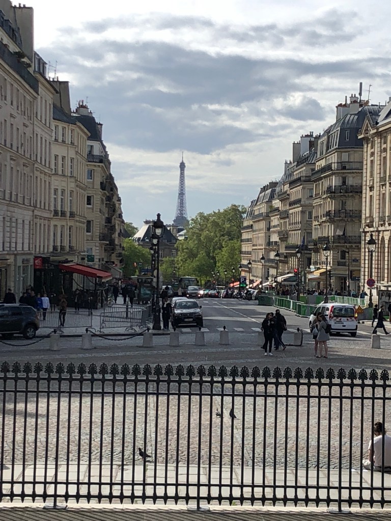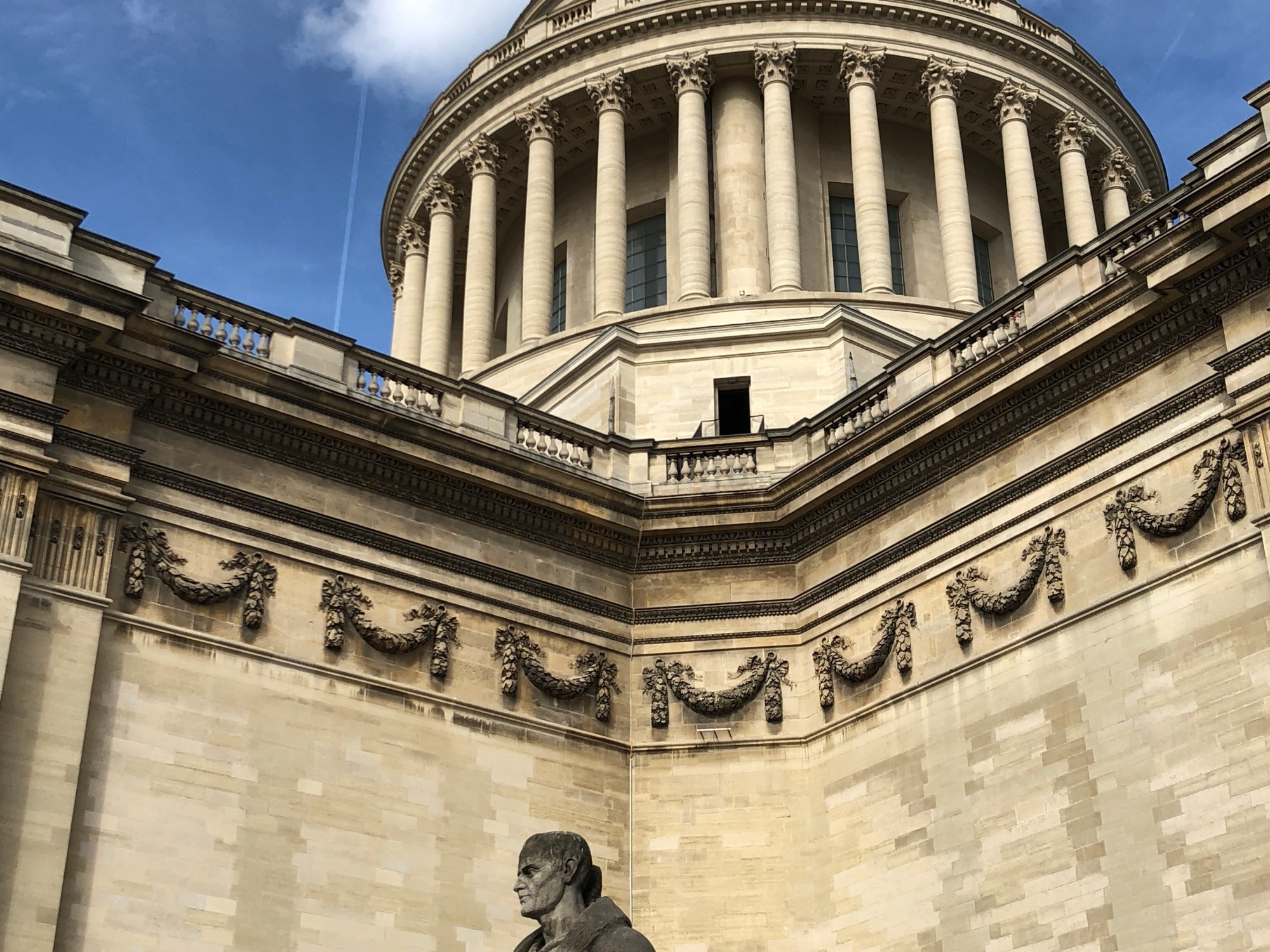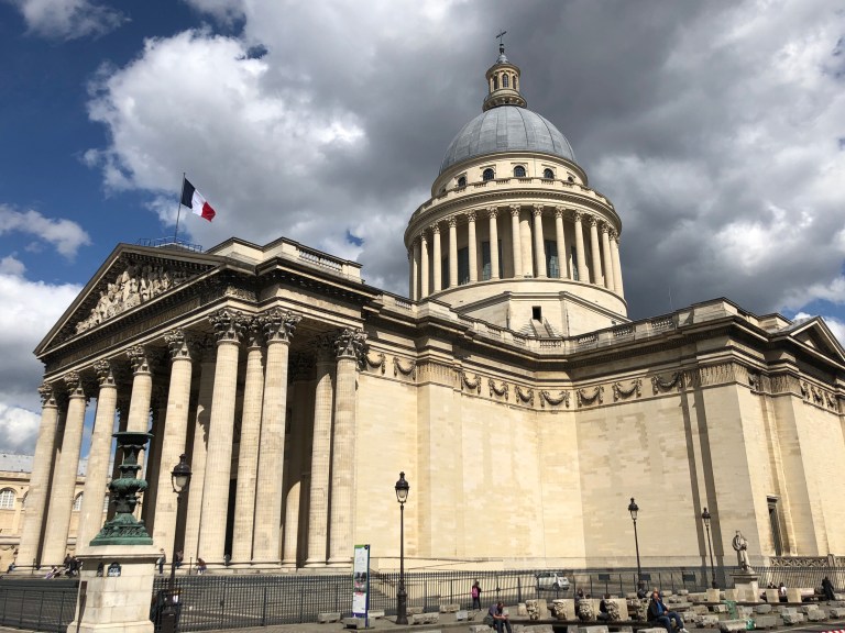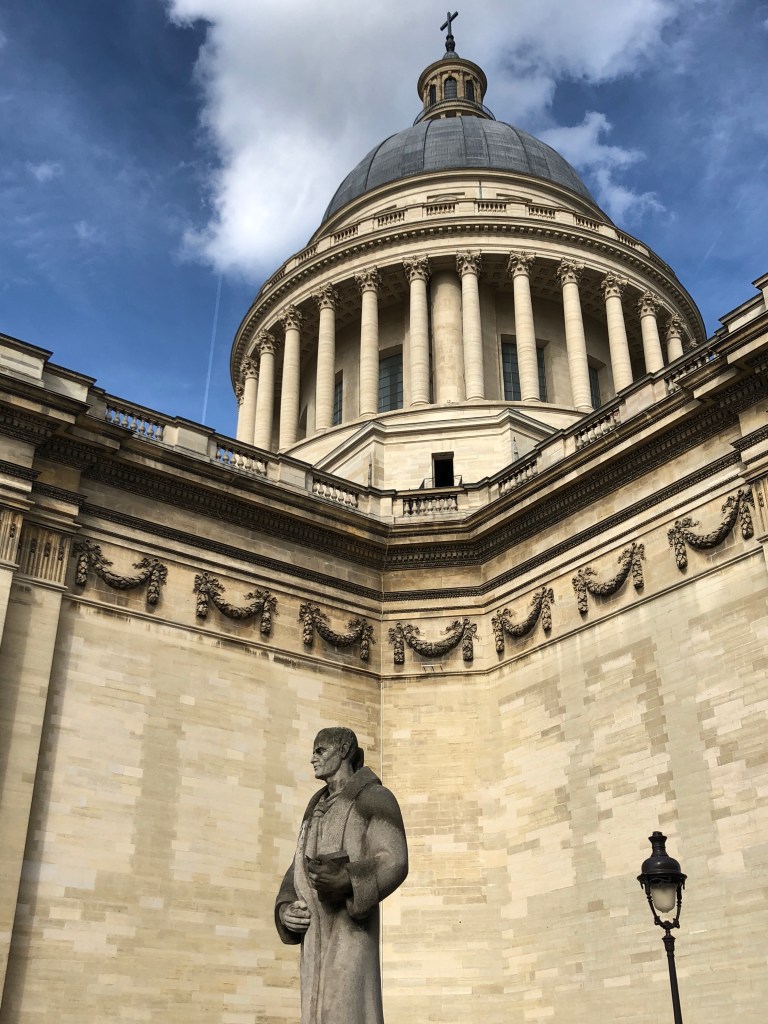 We started out today to visit the Pantheon. The Pantheon is in a “quarter” (district or “arrondissement“) in the 5th arrondissement of Paris. The Pantheon started out as a church dedicated to St. Genevieve (patron saint of Paris) and was intended to contain her relics, but following the French Revolution, the church was transformed, into a “shrine of reason”. Thus, the Pantheon, the church, became a gigantic mausoleum. And this church/mausoleum is truly gigantic. More on this in a bit.