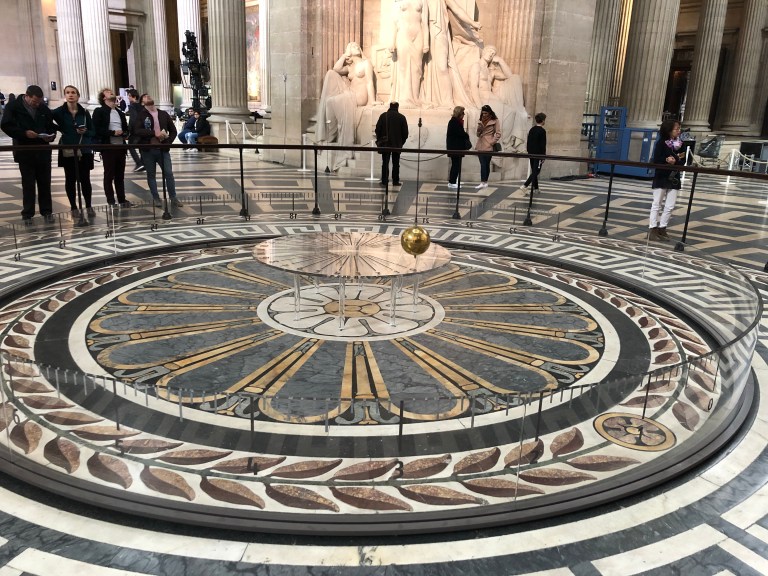 The central portion of the building, under its dome has Foucault’s pendulum, which was built to illustrate that the earth revolves on its own axis. The length of the cable (important) holding the orb runs from the dome ceiling down to where the orb is suspended.