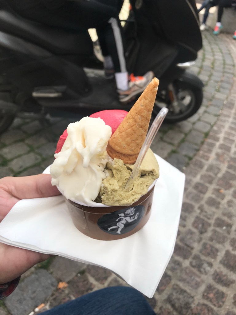 A square near the Pantheon is full of neighborhood cafes, une boulangerie (bakery, a staple of every neighborhood) , and an Amorino gelato shop (we shared)