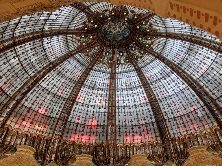 Yesterday we visited Galleries Lafayette, an enormous department store. It and Au Printemps are the two dominant department stores. Galleries is located near the Opera Garnier. On one corner stands a six story building dedicated to menswear. Across the street is a building dedicated to women’s wear, household goods. On a third corner, two floors constitute their food hall (first time for us visiting the food halls). We went Friday thinking it had to be less crowded than it would be on Saturday. But it was really crowded. Inside the store are departments from virtually any premium name brand fashion or jewelry retailer. I don’t know the economics of the arrangements, but imagine each brand is a (manufacturer’s) store within the store.