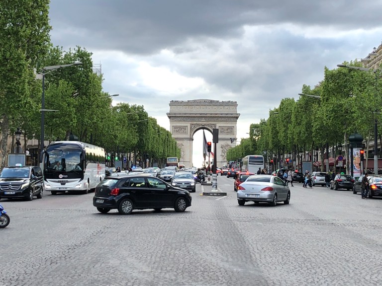 We had not ventured up the Champs Elysee, famous for the Axis it forms in Paris, where on a good day, you can stand with the Louvre on one end and see the Grand Arche de la Defense (office building) on the other, with the Arc de Triumph in between. On a Saturday, the wide sidewalks are massively crowded. The Champs Elysee is lined with shops, restaurants. You’ll see a few American names (Five Guys has come to Paris), but mostly French. There’s a showroom by Renault (French car manufacturer) with a full sized Formula I race car built of LEGO.