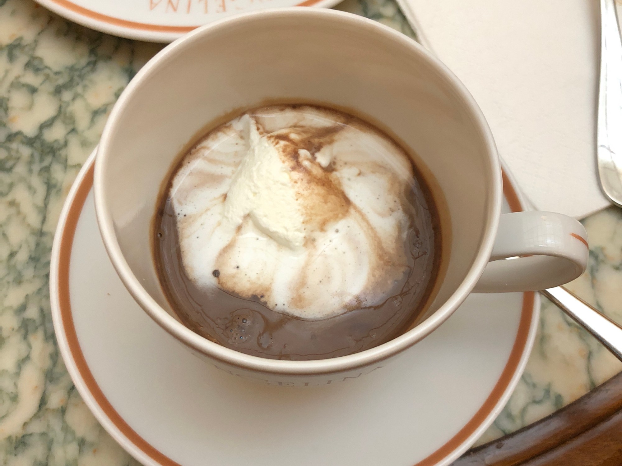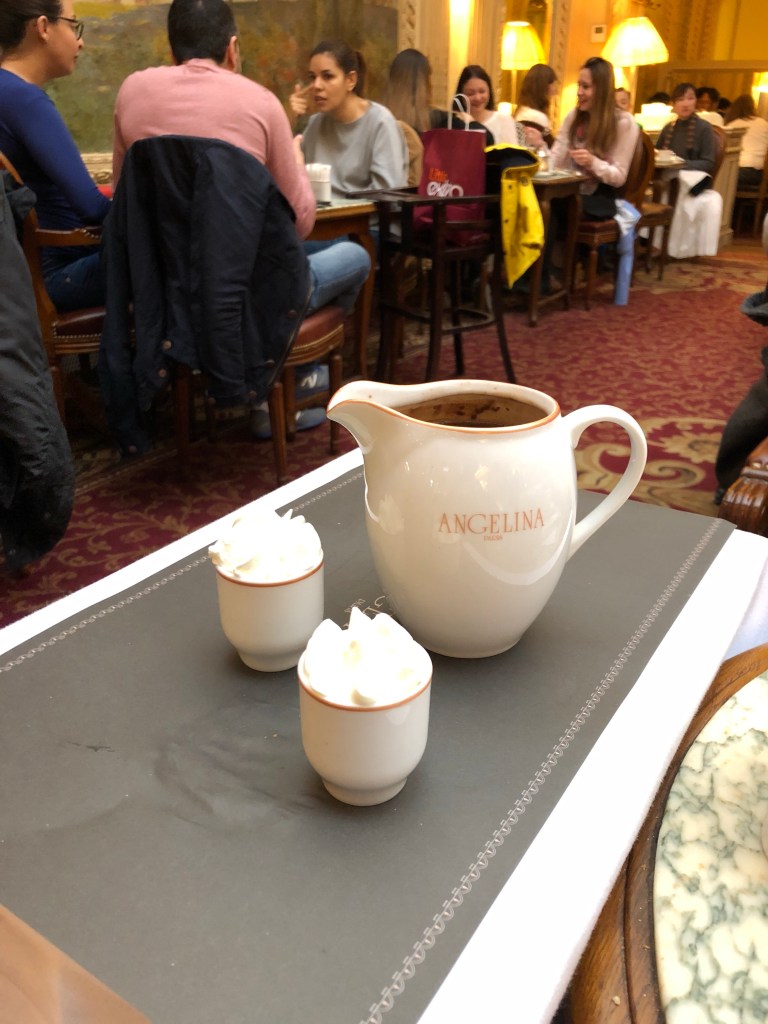 The cool weather was like a magnet for those of us hoping for a brief respite. Even on a good day, there’s a line at Angelina (across rue de Rivoli from the Tuileries), but this one turned out to be a shorter wait time than we expected at 30 minutes. For us, the attraction of Angelina is their chocolate chaud l’African (hot chocolate) made with a blend of chocolates from Africa. It’s intense and maybe too much caffeine for some, but it’s lovely and rich and expensive (about $10 per person). Along with a shared Napoleon pastry, it was a delicious way to while away some time. Each person gets their own little pot of whipped cream to mix into the hot chocolate.