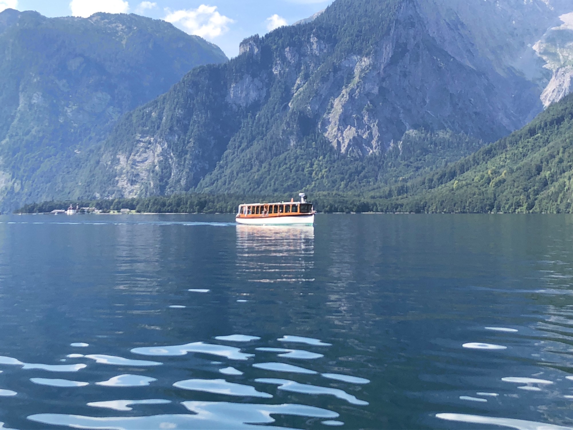 The lake is noted for its clear water and is advertised as the cleanest lake in Germany. For this reason, only electric-powered passenger ships,rowing, and pedal boats have been permitted on the lake since 1909. Passenger services along the length of the lake call at three points: Seelände (Schönau -the main base , St. Bartholomä, Salet (near where the Königsee ends). The longest tour takes two hours from Seelände to Salet. There were 18 electric boats operating today. The last boat back to the base of operations at Schönau is at 6:30pm. If you miss the last boat, they’ll come a get you, but it will cost €250 ($286). Don’t miss the boat.