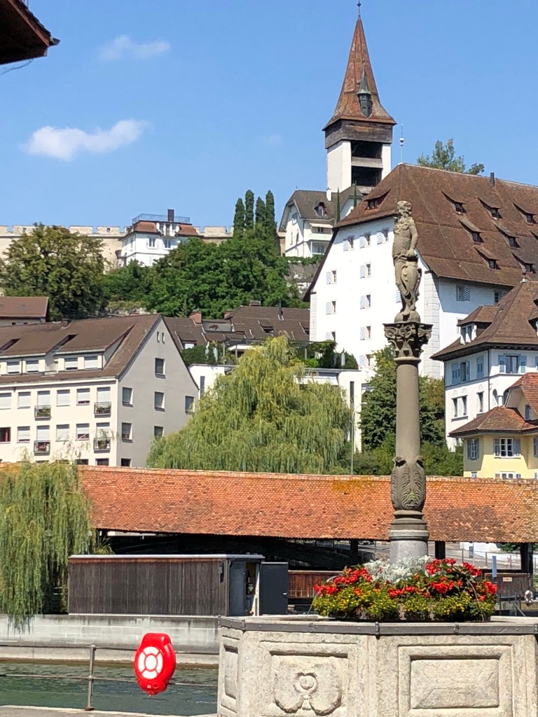 We walked over both of the covered bridges (Kapellebrücke and Steuerbrücke). The archways above you in these bridges have (reproductions) of period paintings. The Kapellebrücke was nearly destroyed 25 years ago in a fire. The city workers were out at the end of the pier in the river near the Steuerbrücke adjusting the wooden staves that direct the water flow. The river is pretty low today, but we’ve seen the river when the snow melt swells the lake and then flows into the river, rising dramatically from summer levels.