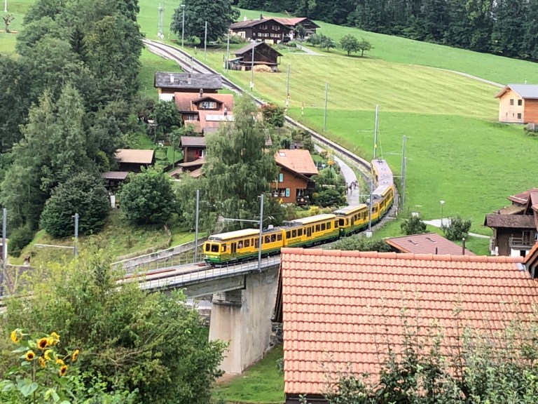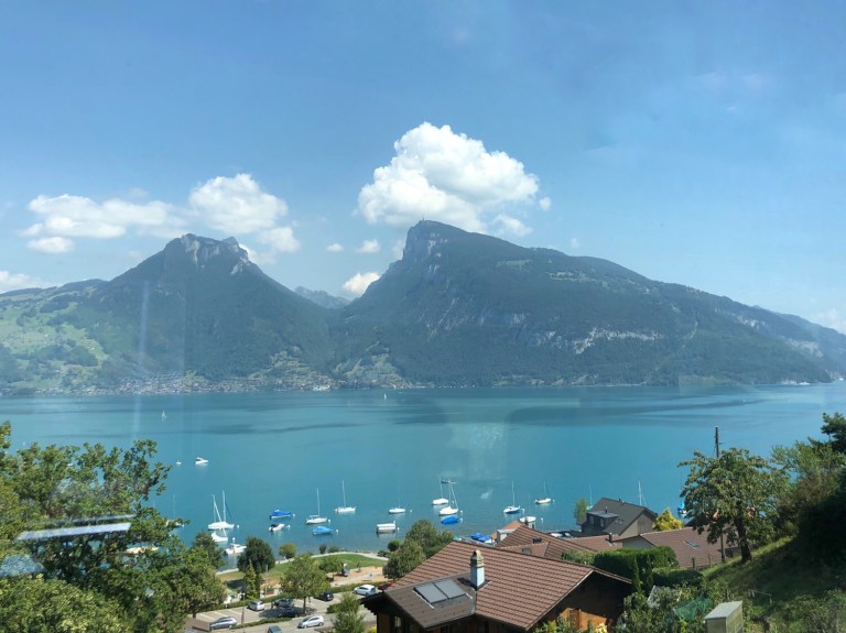 On the way out of Interlaken (Inter = “between” laken= “lakes”) the train takes you past Thunsee and Brienzersee, two alpine glacial lakes. They’re very large lakes and each are summer resort areas.