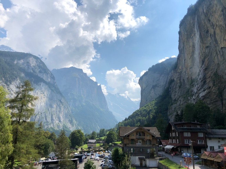 Here in Lauterbrunnen, this is our view from our hotel room The waterfall at the right is called The Staubbach Falls.