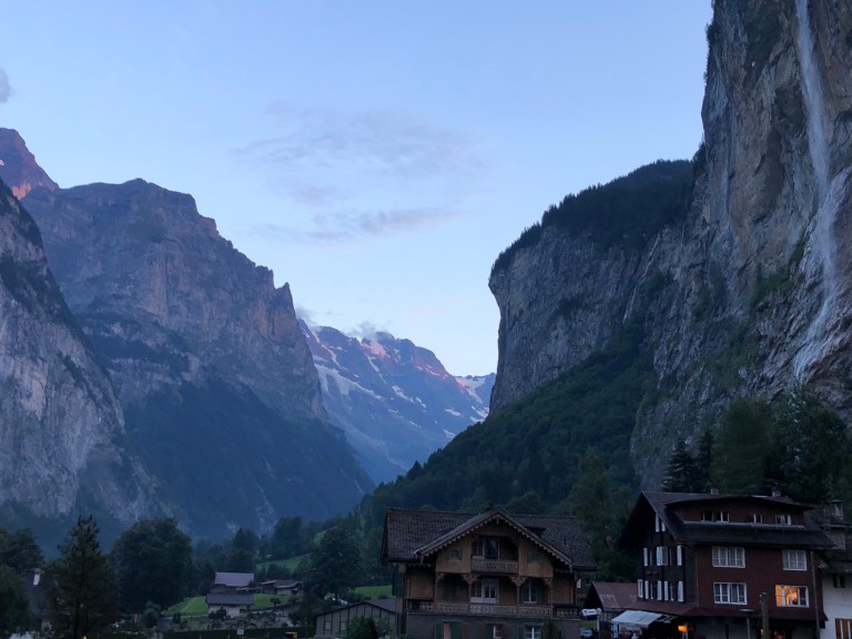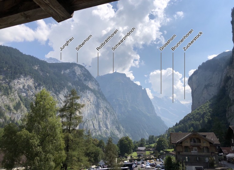 Lauterbrunnen is a small village in a beautiful valley. Literally translated, (Lauter = “nothing but” Brunnen= “fountains or falls”) with 72 waterfalls in the valley , it’s easy to spot them almost wherever you look. Looking out our window when we arrived, we saw two hang gliders. There are other villages higher up above us on the surrounding mountains. These are reachable primarily by train or cable lift. There are probably roads up to those two villages, but they’d have to be pretty steep. You’ll frequently hear the sound of helicopters, because in some areas that is the only means of lifting construction materials in or out of the area.