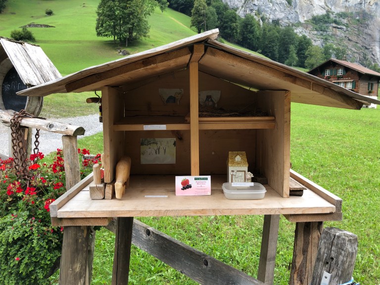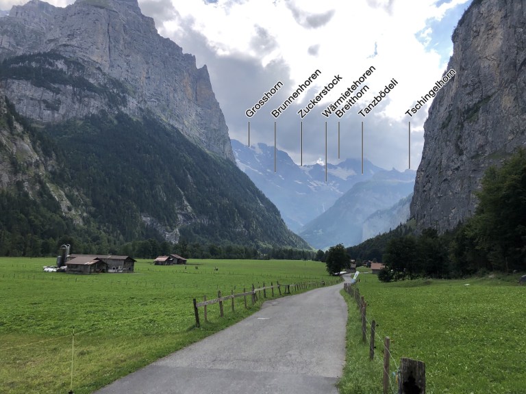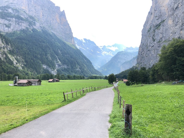 The farms alongside the road (little more than one tractor’s width wide) have already harvested their hay crop for the year. Aside from a tractor or a resident, the “traffic” comes from hikers going up and down the valley. To our left as we walk is the Lütschine river, not particularly high now as the snow melt has already taken place.