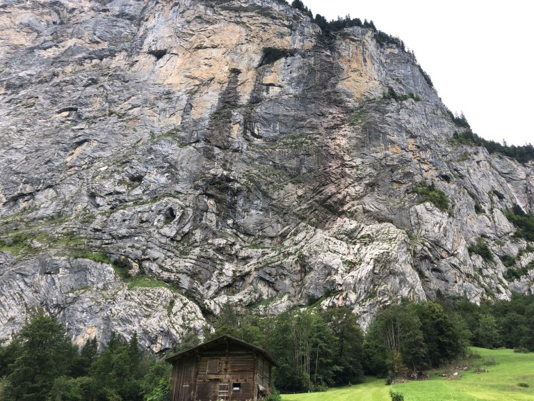 We decided to spend the day in the valley and hike down one of the roads leading out of the valley. Walking out of the village, you emerge into a wide valley with a river through its center and farms scattered across luxuriant sloped green fields. There are no crops besides hay to feed dairy cattle and sheep, unlike Bavaria where the rolling countryside has fields of corn. The steep mountainsides of the Swiss Alps rise up almost vertically on each side of the valley, the result of a collision between the African and Eurasian tectonic plates.