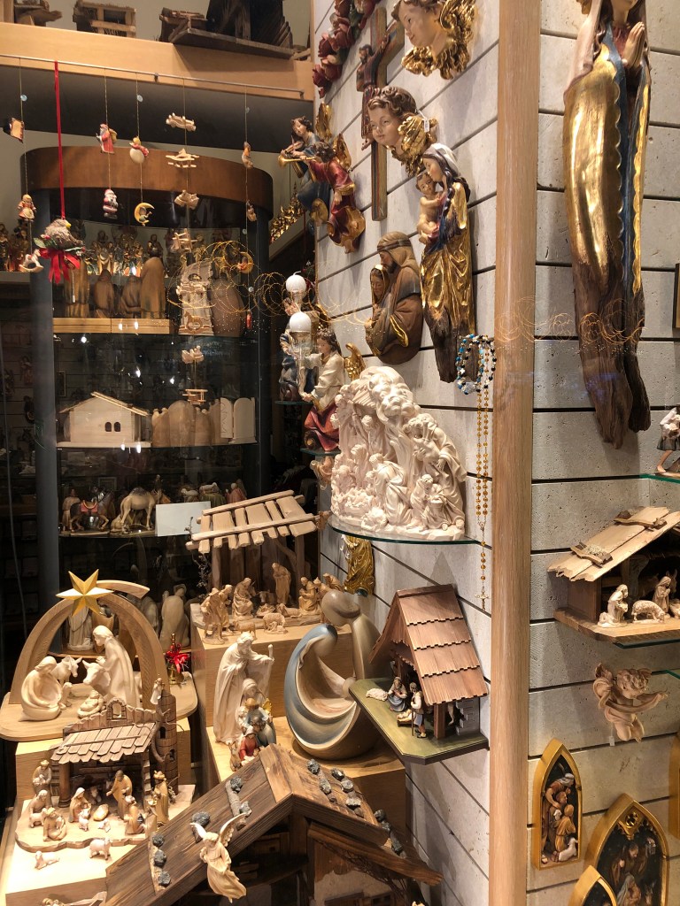The Christkindlemarkt am Hof across the street from our hotel was our first stop and first Christmas market. In the summer, the square is a biergarten, but come November, it’s a Christmas market with many small stands selling sausages, bacon, etc.; other shops sold hand made ornaments , candles, food. A number of stands sold gluhwein (warm mulled wine) and you can buy little decorative cups.