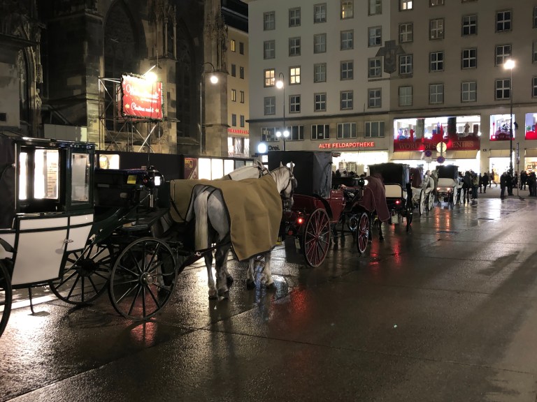 We decided to step into a shop selling lebkuchen and other Christmas decorations as much to look at the wares as to warm up for a few minutes. Along the street on the opposite side of the cathedral, a line of horse drawn carriages awaits.