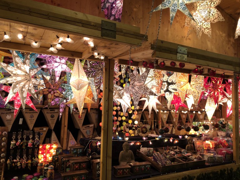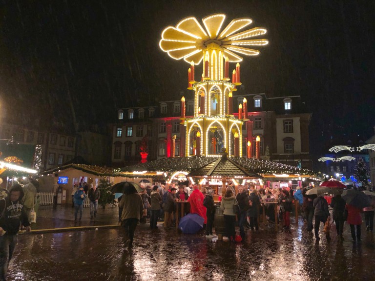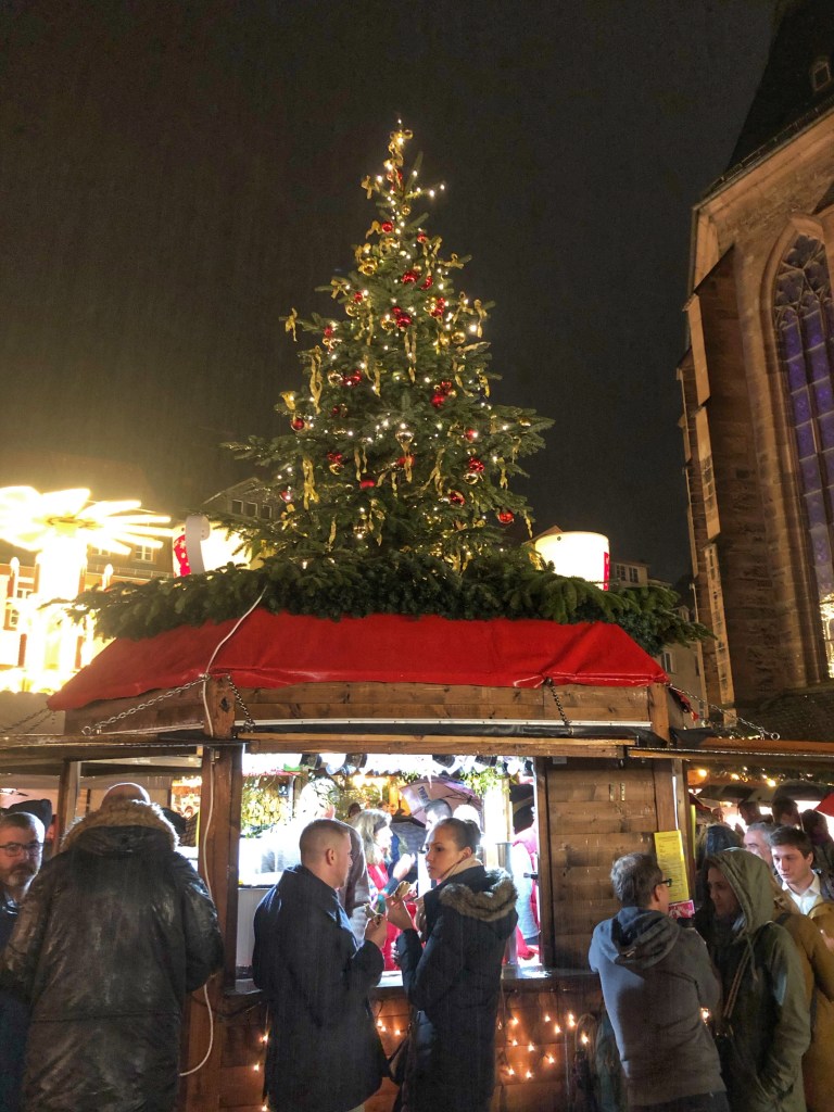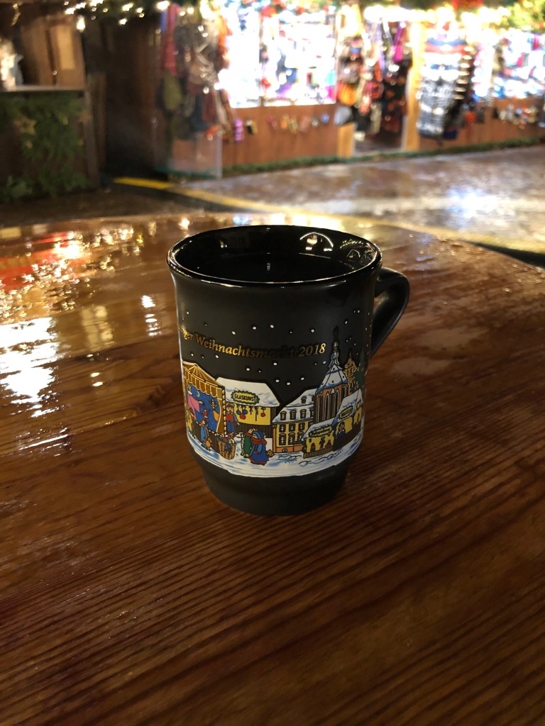 There was supposed to be a market at Bismarktplatz, but it wasn’t there. The first Christkindlemarkt we visited was at University Square down the Hauptstraße (Main Street , a pedestrian area). It was after 4:30 and dark. But the stalls were brightly lit and considering it was Monday and drizzly, about as crowded as you might expect. It didn’t stop us from enjoying some gluhweins and ornament shopping. It was also time for dinner so we had some hot bratwurst mit (with) senf (mustard)