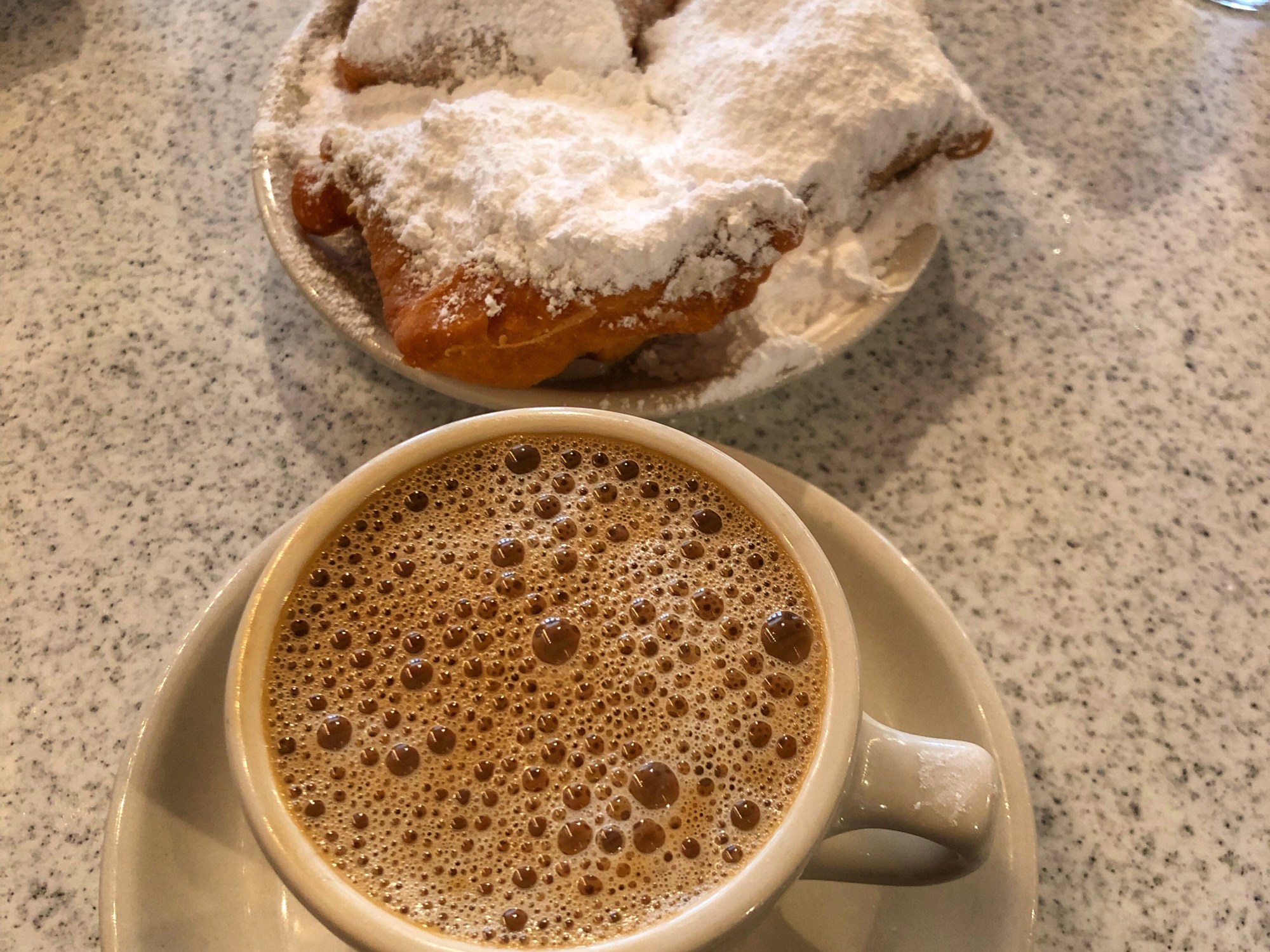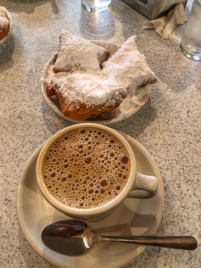 It’s obligatory to have some cafe au lait with chicory, blistering hot. We just might come back here again.