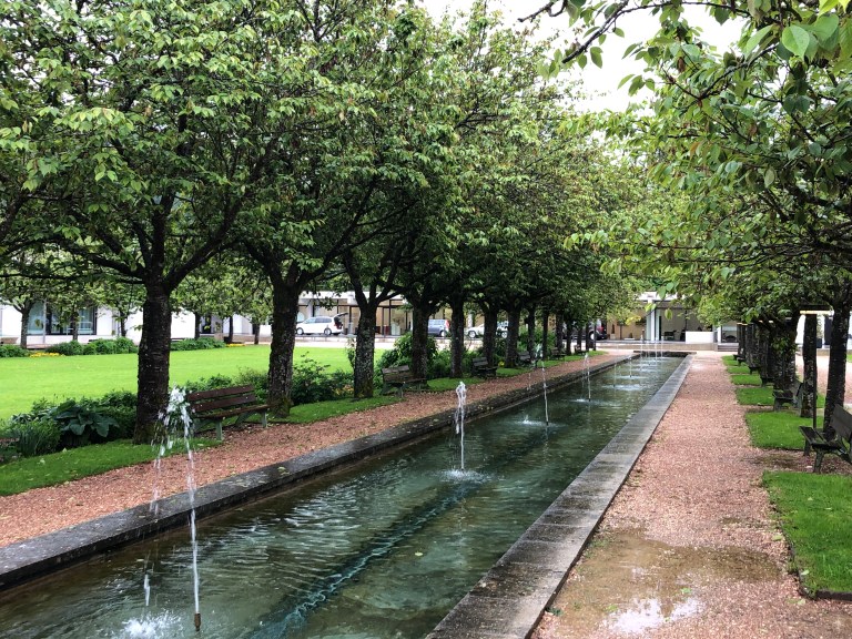 Walking across the street, there is a garden, the Kurgarten with fountains lined by trees on each side.
