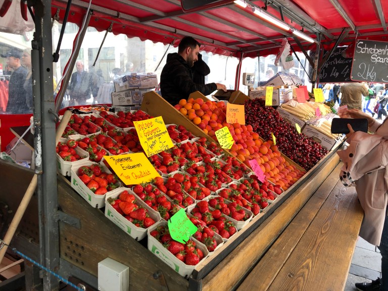 In addition to the street performers you may see, there are a number of fruit and vegetable stands selling current produce (today mostly strawberries and white asparagus or “spargel”). It all adds up to a type of ambience not seen in most American cities.