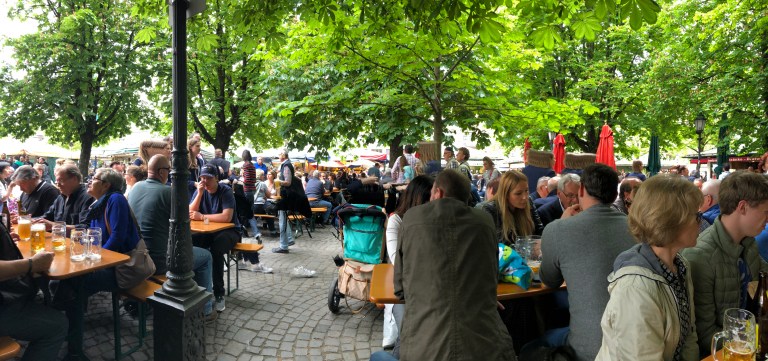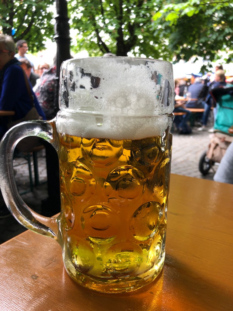The Biergarten was packed and we had to hunt for a while for a place to sit. Some tables are reserved by restaurant patrons, but most are open seating. Ein Mäß (one liter) bier was €8,20 or $9.16, you can buy a half liter (Radler), but why bother 😉 ?