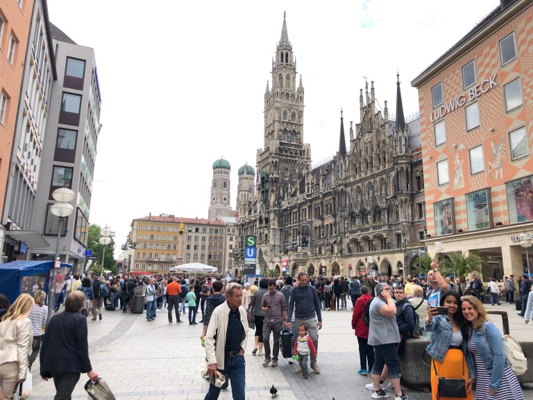 Along the pedestrian route of the Marienplatz are churches, department stores, smaller retailers, restaurants, the Rathaus, a Biergarten or two, and some museums. On a normal weekday, it’s busy. On Friday, it’s really busy, Saturday is packed and Sunday, most things except the churches, restaurants and Biergartens (Germans love their bier) are closed. Germany takes its holidays seriously when it comes to retail. Stores close on religious holidays and Sundays and don’t stay open as late as those in the US.