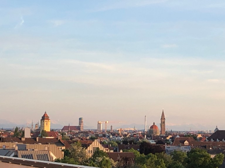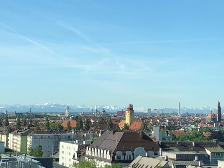 Finally had a break in the mostly cloudy weather we’ve had for the last few days in Munich and you can actually see the Alps from our hotel room window.