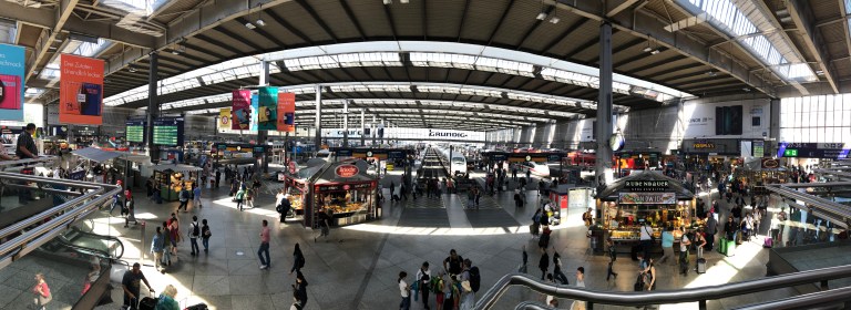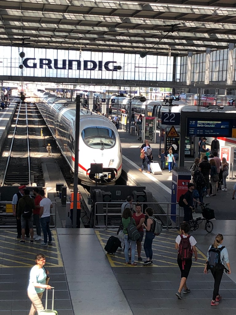 We have 45 minutes to kill before our train arrives and two others will depart earlier from the same track before ours. We found some seats on the second level of the station overlooking the tracks so we can see all the people below rushing to their trains, disembarking, grabbing something to eat from the various Imbis stands.