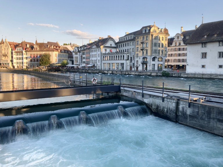 Ahead of us is the (modern) bridge across the river where Lake Luzern empties into the river. This shot of the river is downstream of the lake, but shows how fast it moves.